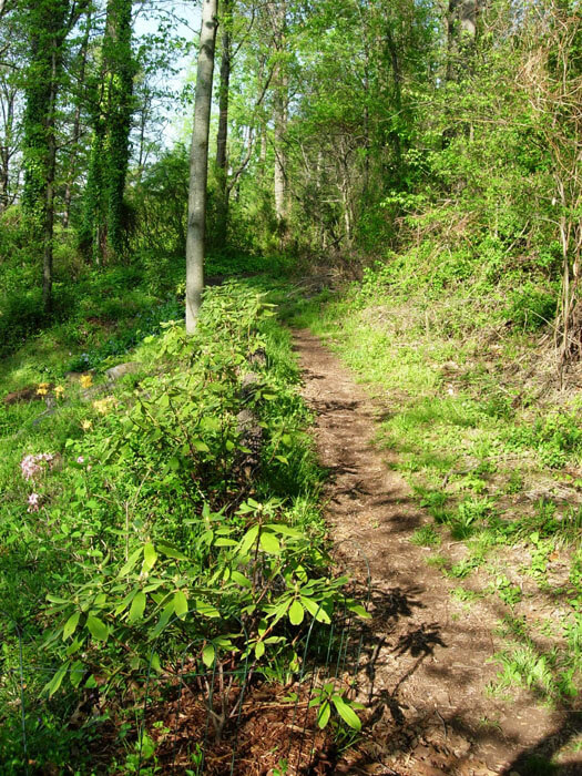 From the start, and quite unavoidably (given the glory of the site), I imagined my garden as site-specific art, a celebration of both place and space. What I wanted—my wife, far the more experienced gardener, ceded the yard to me, as I was obviously obsessed with it—was a seamless transition from the retro-modern ambience of the house to the woodlands above: a garden that would understand and embody "seeming oppositions as sustaining relations."7Miwon Kwon, One Place After Another (Cambridge: MIT Press, 2002), 166. The hardscape of the yard made achieving this goal much easier: near the house rose a series of whitewashed terraces, their walls still in good condition, with a set of concrete steps heading up toward the gate in the chain link fence. But the steps stopped about two-thirds of the way up; here there were still terraces, but separated by slopes rather than walls, and the path curved around to the right before angling back up the slope to the gate. Outside the gate, the natural curves of the hillside had remained, and we discovered a lush, level area with a limestone outcrop just below the footpath. When we moved in, all of this was overgrown with vines and all the invasive (sometimes botany employs political discourse, too) non-native species mentioned above—mercifully minus kudzu but plus mimosa. Our discovery that the fence even had a gate was the result of an almost archaeological investigation.