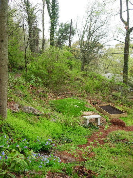| Start of the raised vegetable bed, with Virginia bluebells lining the path, Carolina silverbell and wildflower patch with Trillium cuneatum in foreground, Alabama snow-wreath left of the bench, and Rhododendron 'Maxecat' at bottom left corner. Birmingham, Alabama, March 30, 2008. Photograph by Jon Smith. |