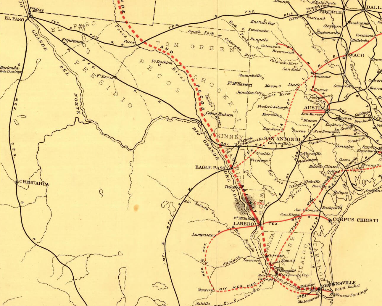 | Rio Grande and Pecos Railway Company, Detail of a map of the Rio Grande and Pecos Railway showing the locations of Brownsville, Laredo, and Eagle Pass, 1882. Courtesy of Library of Congress Geography and Map Division, catalog number 98688791. |