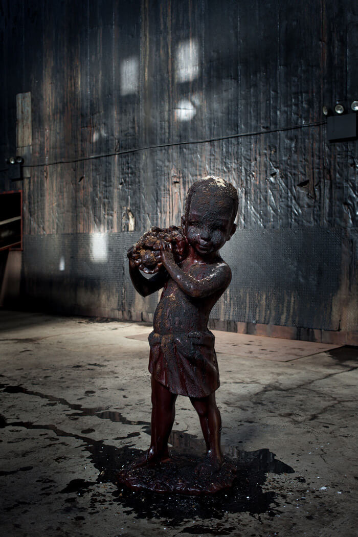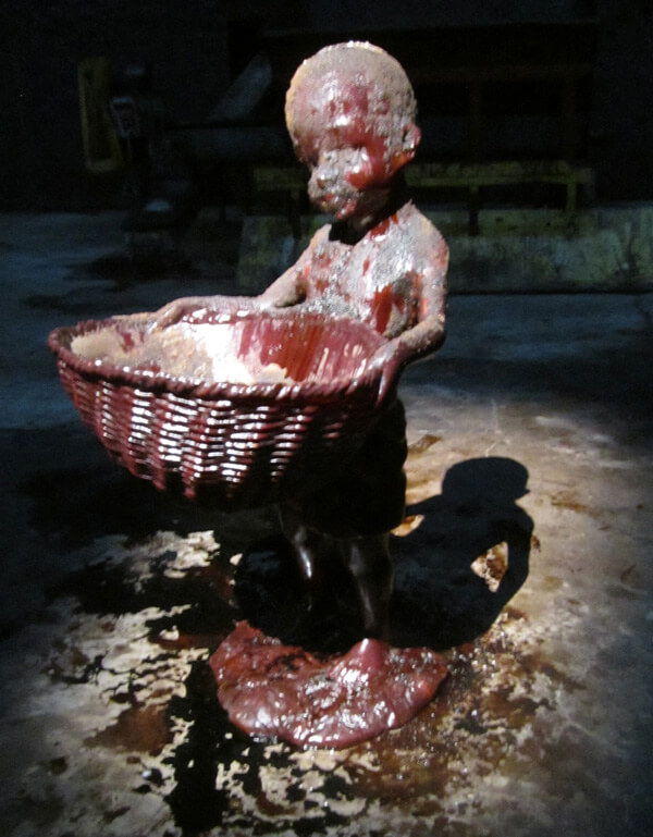 Meandering wingless African cherubs pave the way to the monstrous and marvelous Sugar Baby. These five-feet tall black children, enlargements of collectibles, which could be found at the front door of a white southern home or sugar plantation, signifying "Southern hospitality," carry bananas or food in baskets.15"Walker went down a rabbit hole of sugar history, at one point stumbling on some black figurines online—the type of racial tchotchkes that turn up in a sea of mammy cookie jars," Audie Cornish, "Artist Kara Walker Draws Us Into Bitter History With Something Sweet," National Public Radio, May 16, 2014, accessed June 30, 2014, http://www.npr.org/2014/05/16/313017716/artist-kara-walker-draws-us-into-bitter-history-with-something-sweet. The cherubs' sweet smiles, apple cheeks, and potbellies merge into the most terrifying part of the installation. Two months into the exhibit, the statues have changed, deteriorated, or disintegrated. A majority of the figurines are made of resin covered with molasses. The molasses cherubs, made of a viscous and dark by-product of cane refining, stand in sharp contrast with the white and powdery confectionary sugar of the sphinx. The crumbling molasses sculptures each weigh four hundred pounds: surprising for their true-to-life size. Kara Walker threw broken body parts and remains into the fruit-bearing baskets of their surviving brothers. The offering of food turns into an offering of human flesh, gesturing that sugar production and consumption are acts of cannibalism. My 2013 book The Tropics Bite Back was an effort to demonstrate that the image of the cannibal was projected onto Amerindians or Africans to dehumanize them.16Valérie Loichot,The Tropics Bite Back: Culinary Coups in Caribbean Literature (Minneapolis: University of Minnesota Press, 2013). See also Mimi Sheller's Consuming the Caribbean: From Arawaks to Zombies (London: Routledge, 2003) and Jack D. Forbes's Columbus and Other Cannibals (New York: Seven Stories Press, 2008). Walker's installation makes clear that the true cannibalism was the machinery of colonization and enslavement.