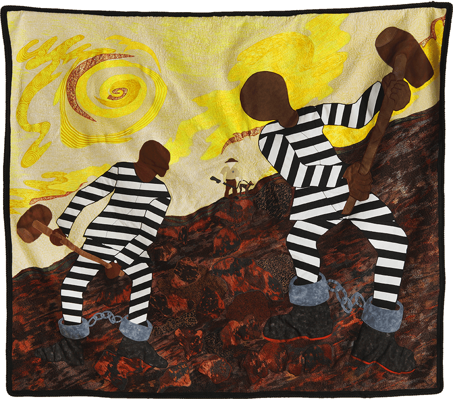 Magee's use of spiral elements lends universality to her compositions. The angry sun, an agitated disc in the chain gang quilt, combines shape, motion, and intense color to emphasize the scene's heat. A spiraling background texture echoes the sun.
