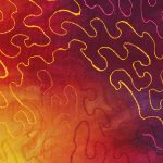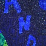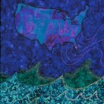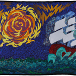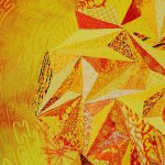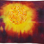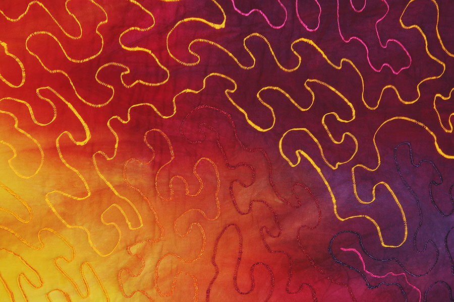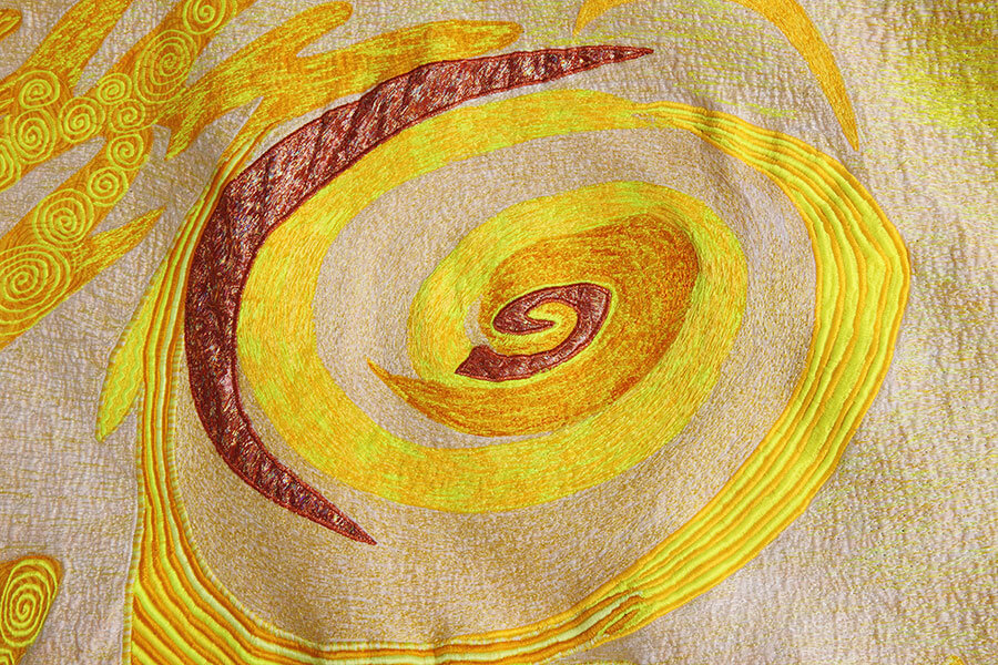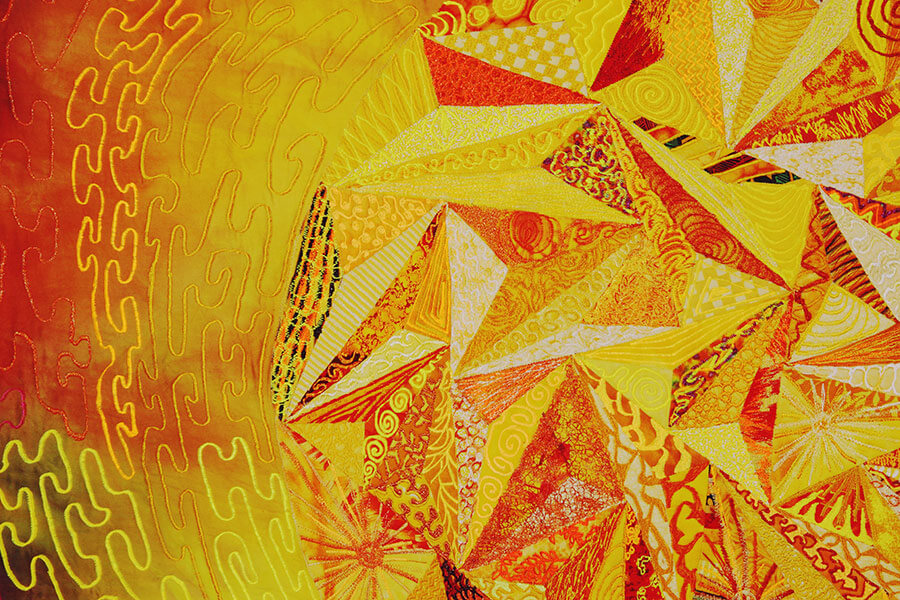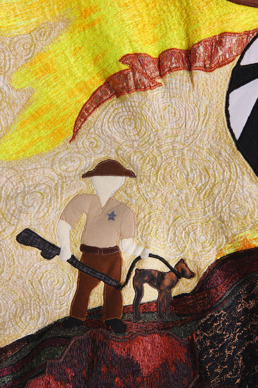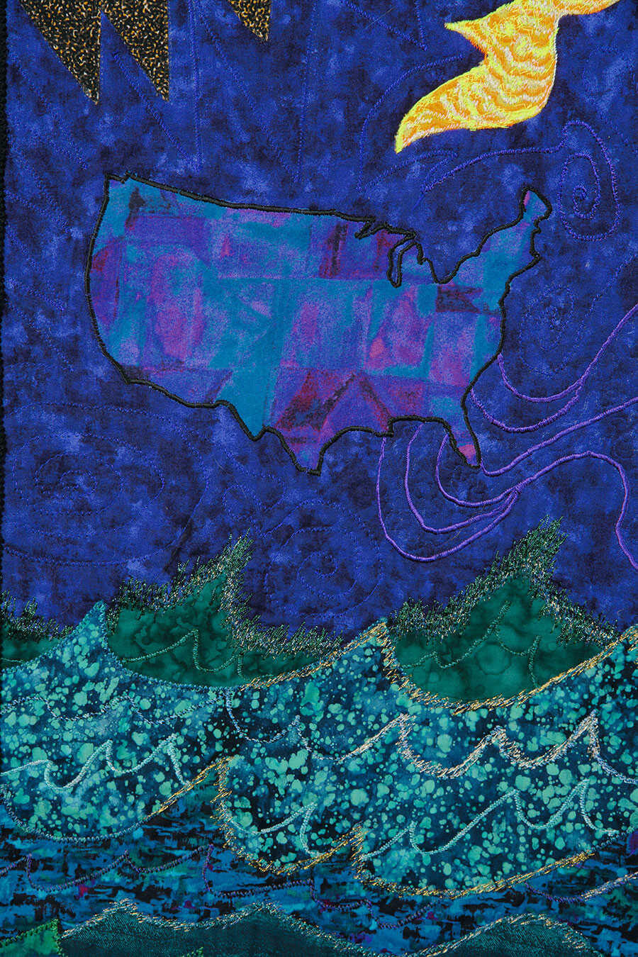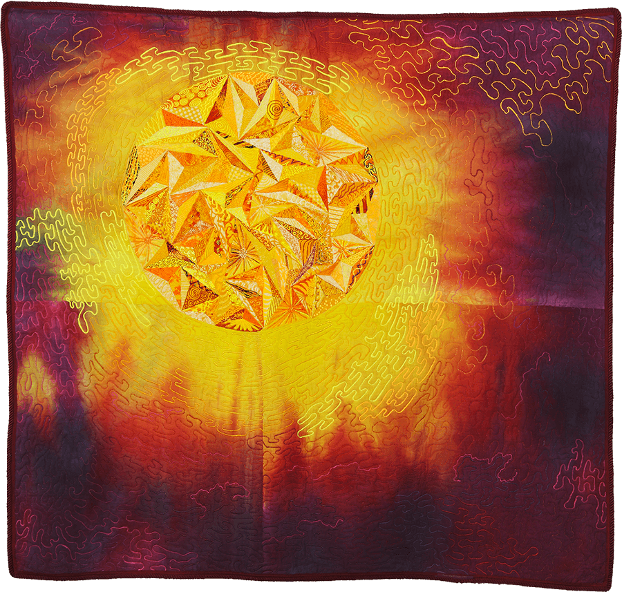 The climax of the first stanza of Johnson's anthem is the title phrase for Magee's Our New Day Begun. A geometrically complex sun shines forth from a hand-dyed background, its luminosity enhanced with intricate lines of shading from meander lines of variegated thread work. The rising sun of this text is not the angry, spiraling sun of other works, but a glowing symbol of purpose and belief in the future.