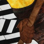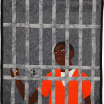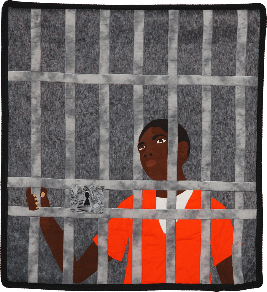 The face above the prison orange peering between bars—the same face as the eager graduate in Full of the Hope—stands in for a generation of black youth caught in persisting structural conditions of poverty and lack of education who may become a part of modern-day mass incarceration.