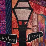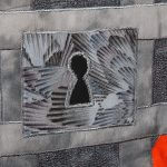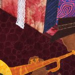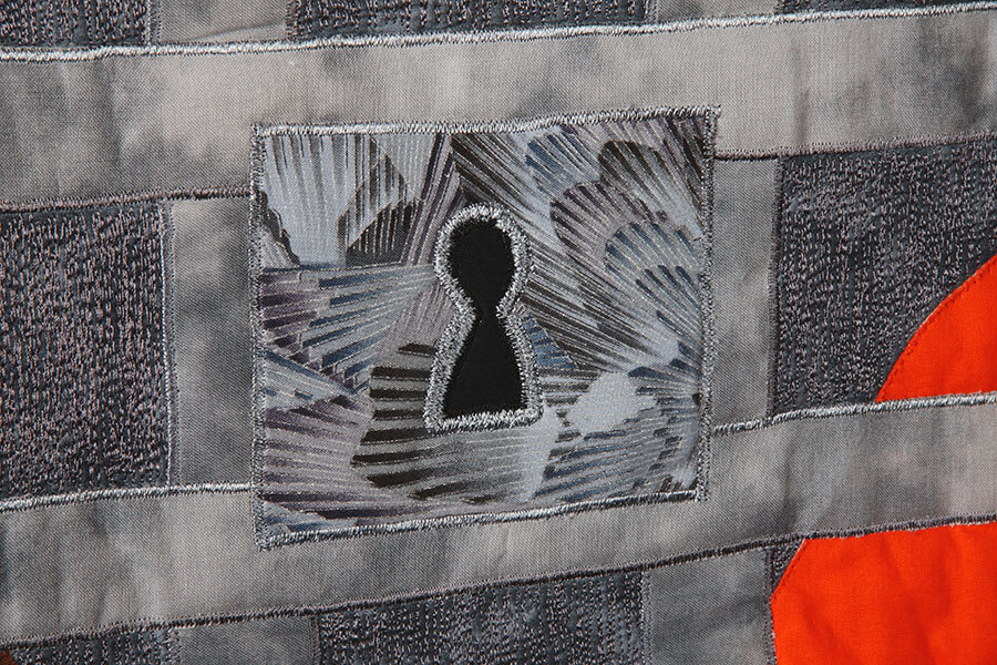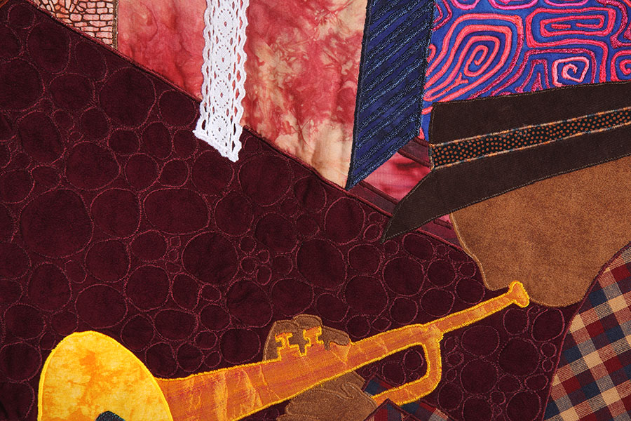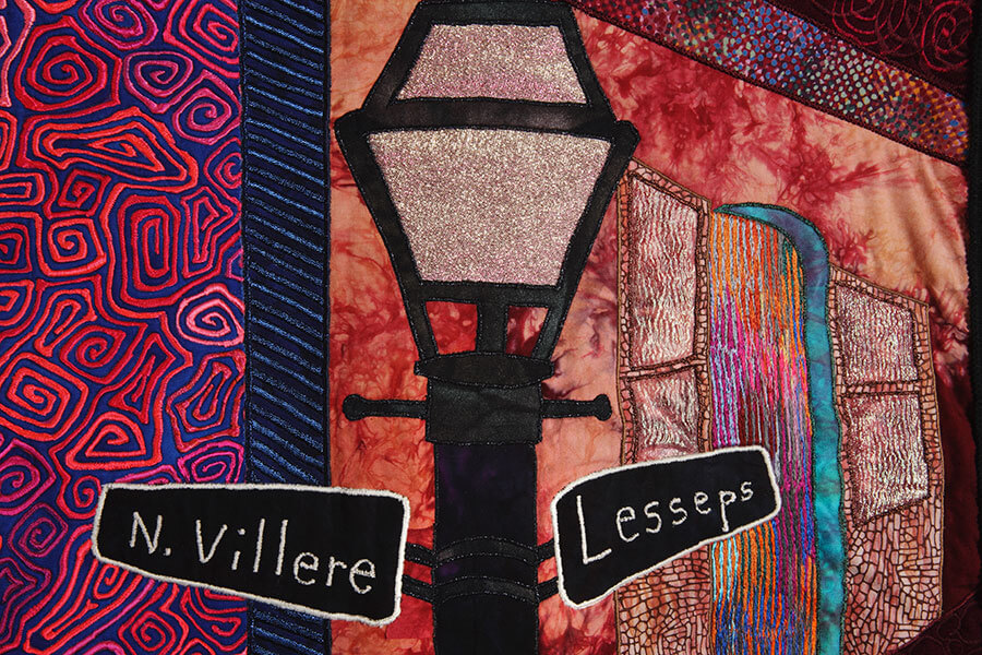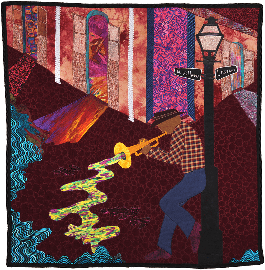 Multiple details—the variety of specialty and hand-dyed fabrics mimicking decorative ironwork, window glass, the musician's alligator shoes, and the luminosity of a street lamp—enhance the strengths of the Katrina narrative told in one vignette. Heavy thread work suggests layers of architectural and cultural history on a typical street corner. The featureless figure of a musician propped against a street lamp stands in as a cultural icon. The spiral elements make their appearance, but in this work they are distorted and their perpetual motion diverted. On first glance, an arched doorway appears to frame rich shadows and coloring achieved with intense thread work that, when examined, emerge from the background as a montage of abstract images—a spiraling hurricane, rampaging water, a levee break—framed by an architectural feature.