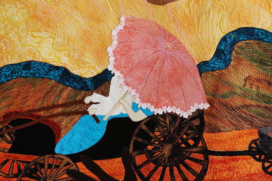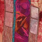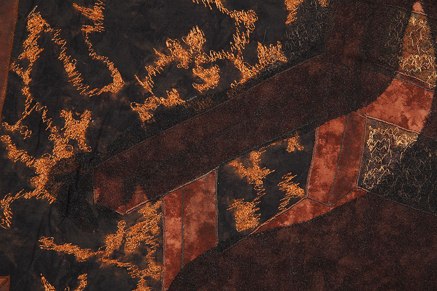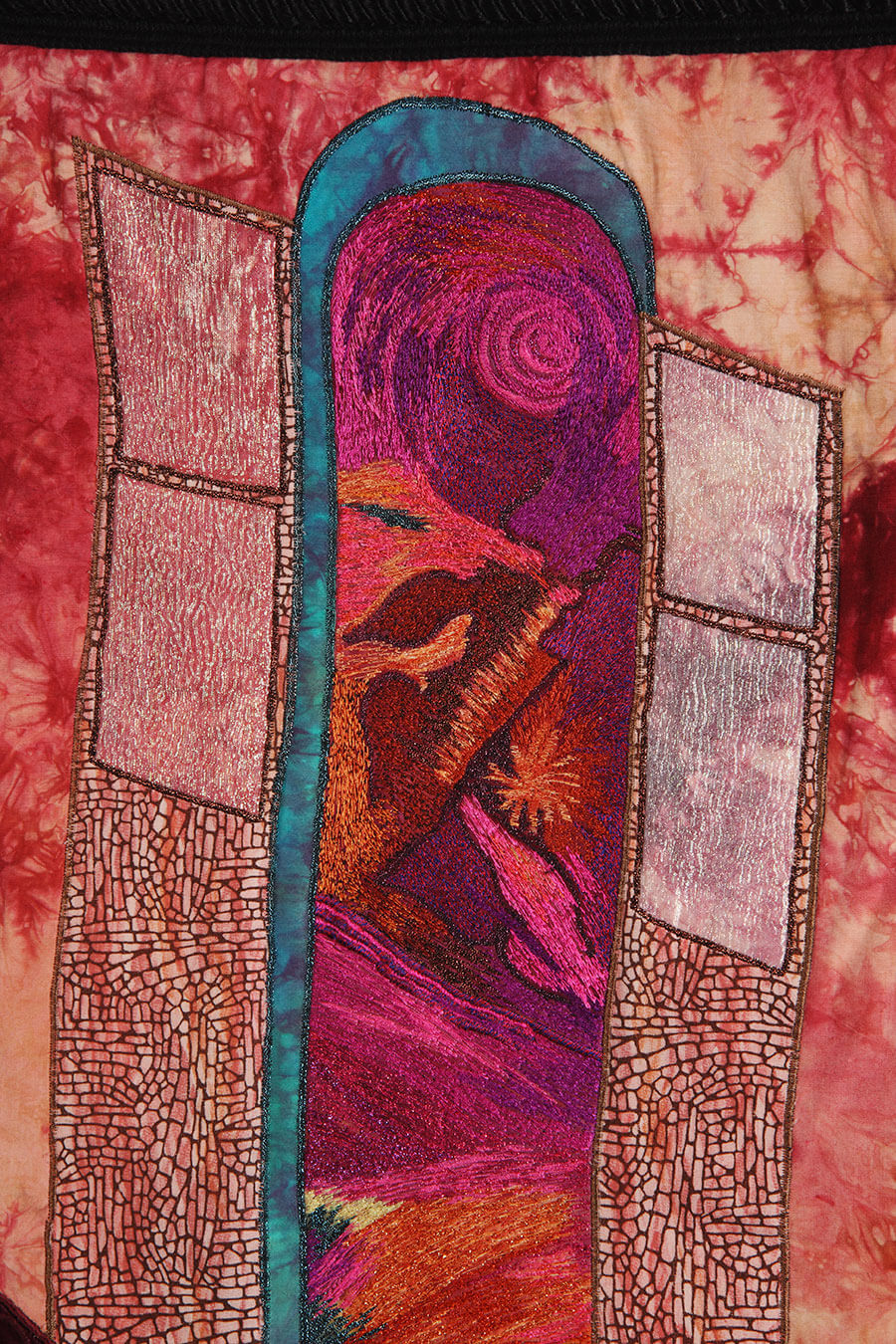 This work combines techniques and design elements characteristic of Magee's style: diversely textured fabrics, intense color to enhance the mood, and heavy threadwork. The threadwork (often created with free motion machine embroidery) builds up textures in layers and helps unify the surfaces across a body of work, just as a painter's brushwork can become a style signature.