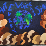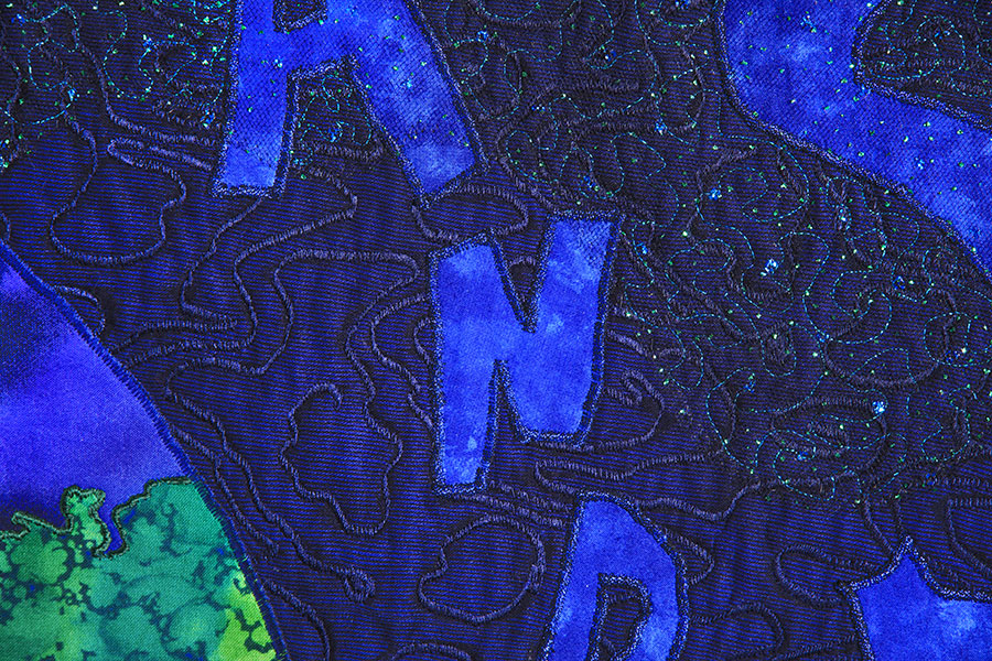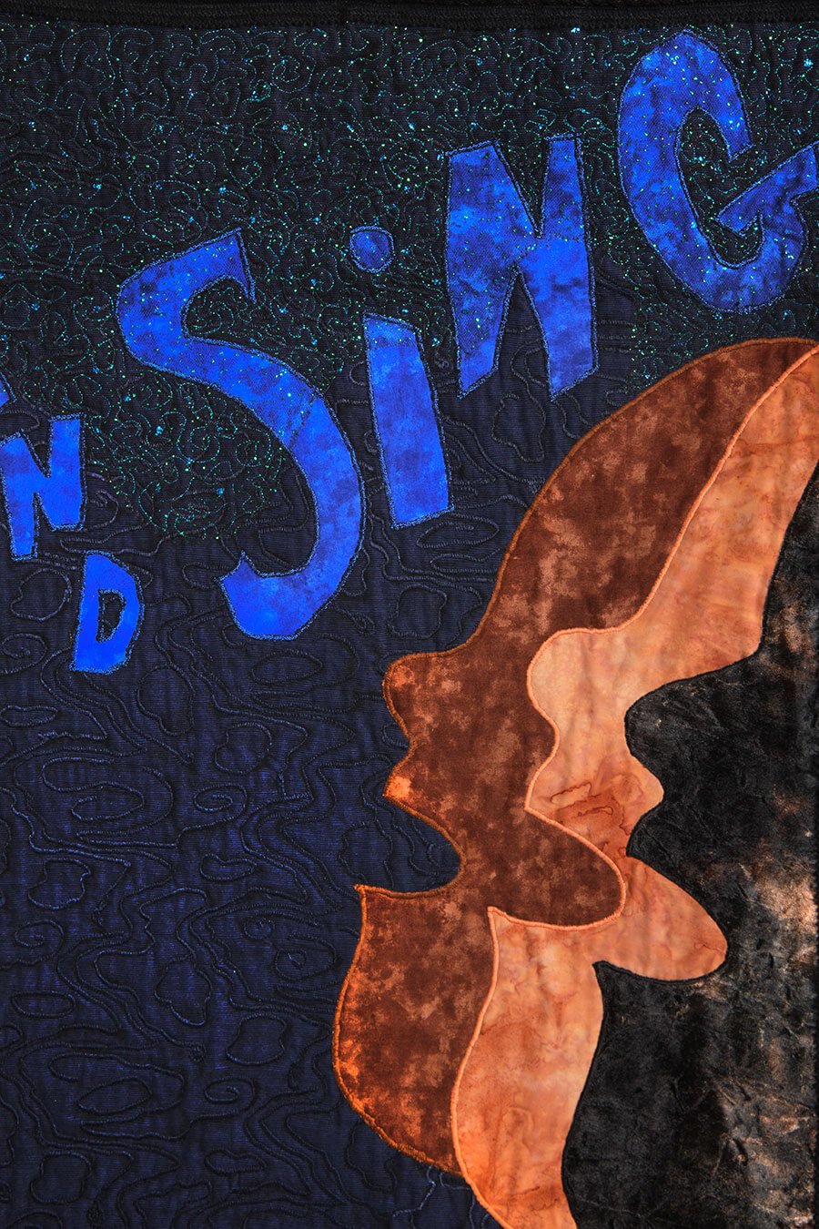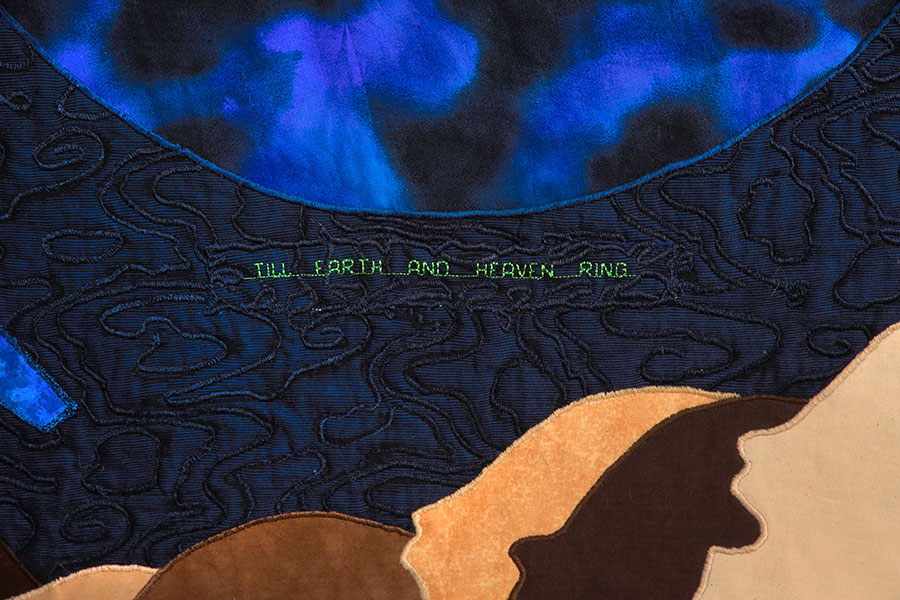 The placement of the globe and text in a night sky, enhanced with sparkling stars and a texture of meander quilting suggesting swirling galaxies, connects this title piece to the "the blue marble"19A description of the term applied to the planet Earth, as described by the crew of Apollo 17: http://life.time.com/history/blue-marble-apollo-17-photo-of-earth-from-space/#1. Meander quilting is a technique in which non-overlapping quilting stitches meander across a quilt in a fluid, seemingly random fashion. perspective of earth, as viewed from space. The rainbow of faces lifted in hope, and the implied voices lifted in song convey Magee's hope for a universe that will "ring with the harmonies of liberty."