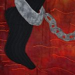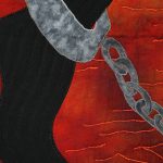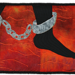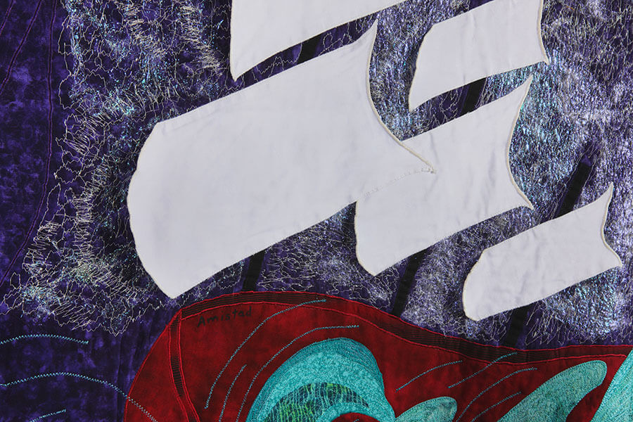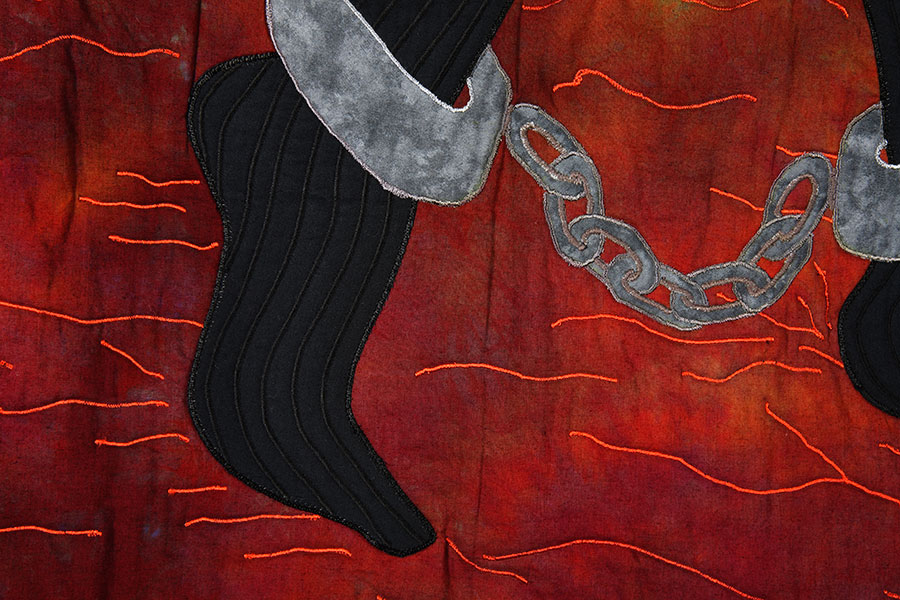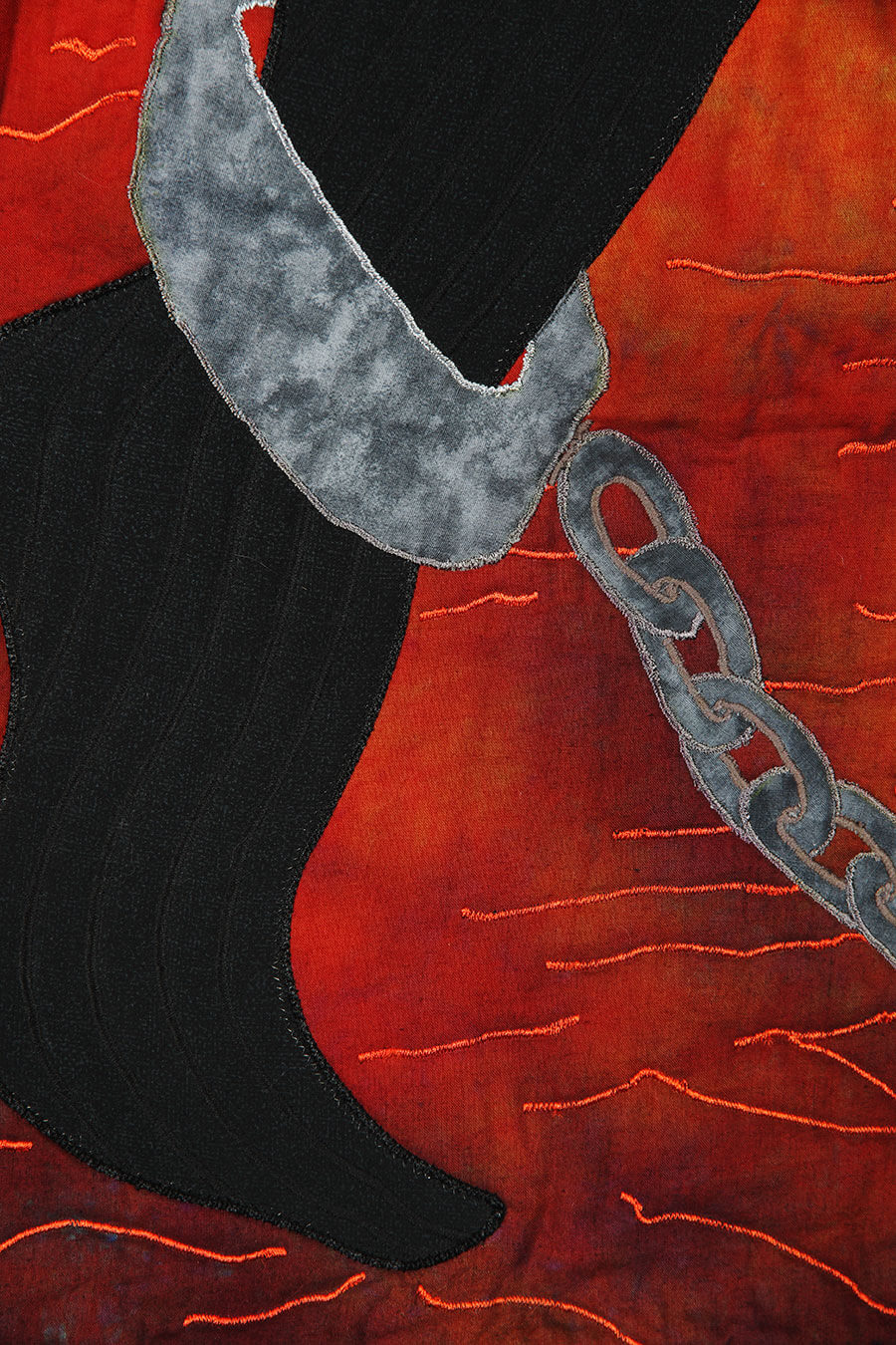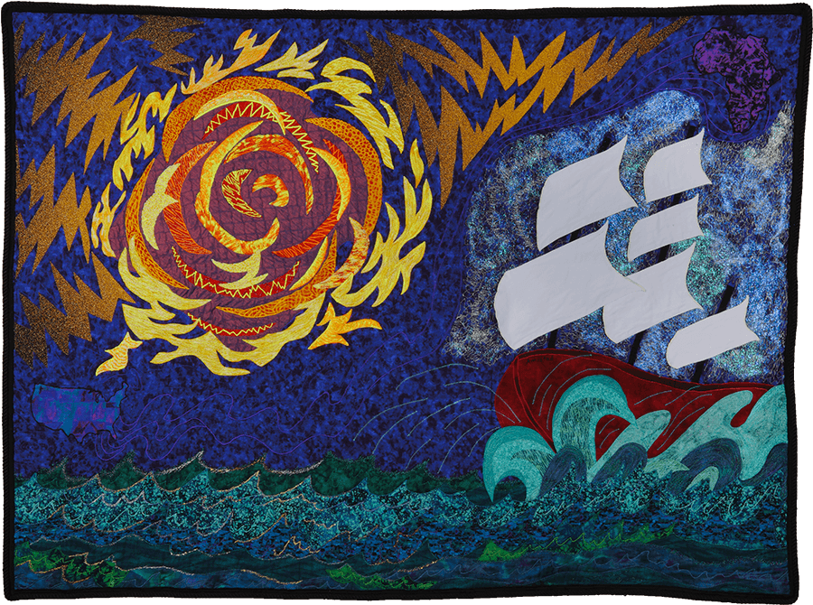 On completion of Lift Every Voice, Magee began another African American history series. Expendable Cargo is representative of this body of work depicting harrowing facets of enslavement—here, the jettisoning of human cargo to rid a pursued ship of incriminating bodies. The shape of the quilt emphasizes the descending human figures, weighted and dragged downward by restraints, silhouettes shackled together, sinking through the depths of blue waves.