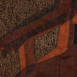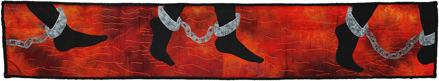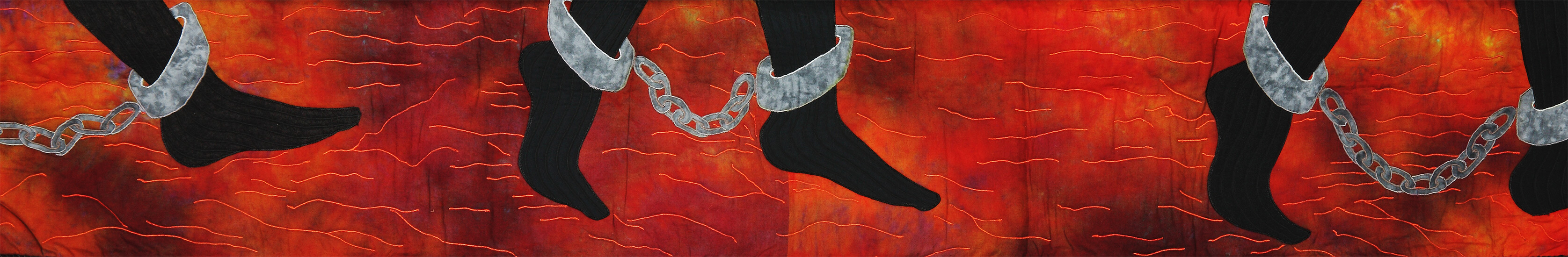 A variegated deep red background and profiled black feet suggest the bloody treks of shackled slaves traveling to unknown destinations, before and after the Middle Passage. The horizontal format of the quilt emphasizes the distance of these treks over perilous terrain. Interior contour lines emphasize the three-dimensiality of the trudging feet.