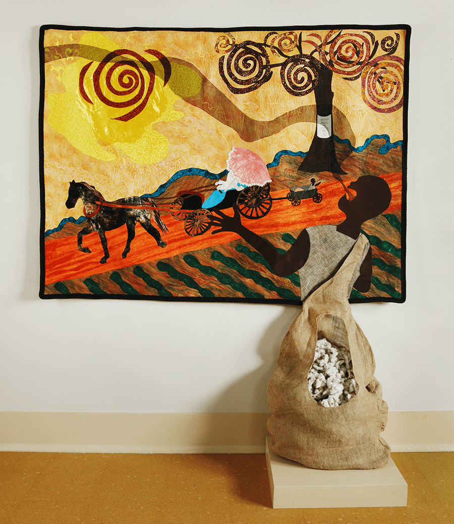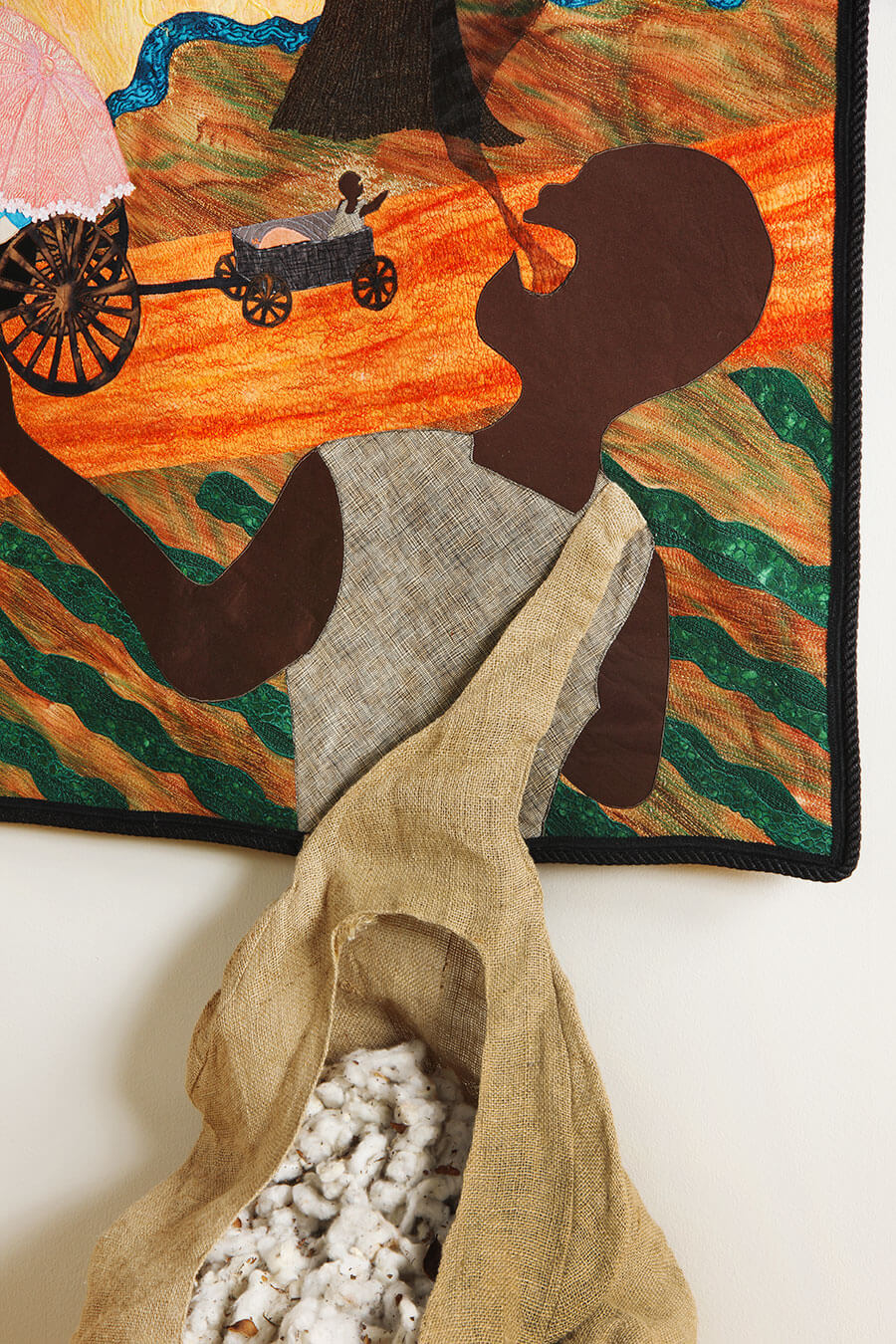 The action originates in the viewers' space as the three-dimensional sack of cotton drags out of the picture plane and anchors the mother in a powerless dimension. Viewers who approach this work are drawn into the narrative and to the figure whose futile scream floats above the carriage. Her featureless profile with its screaming mouth echoes the cries of countless mothers during generations of American slavery.