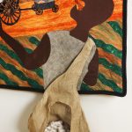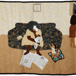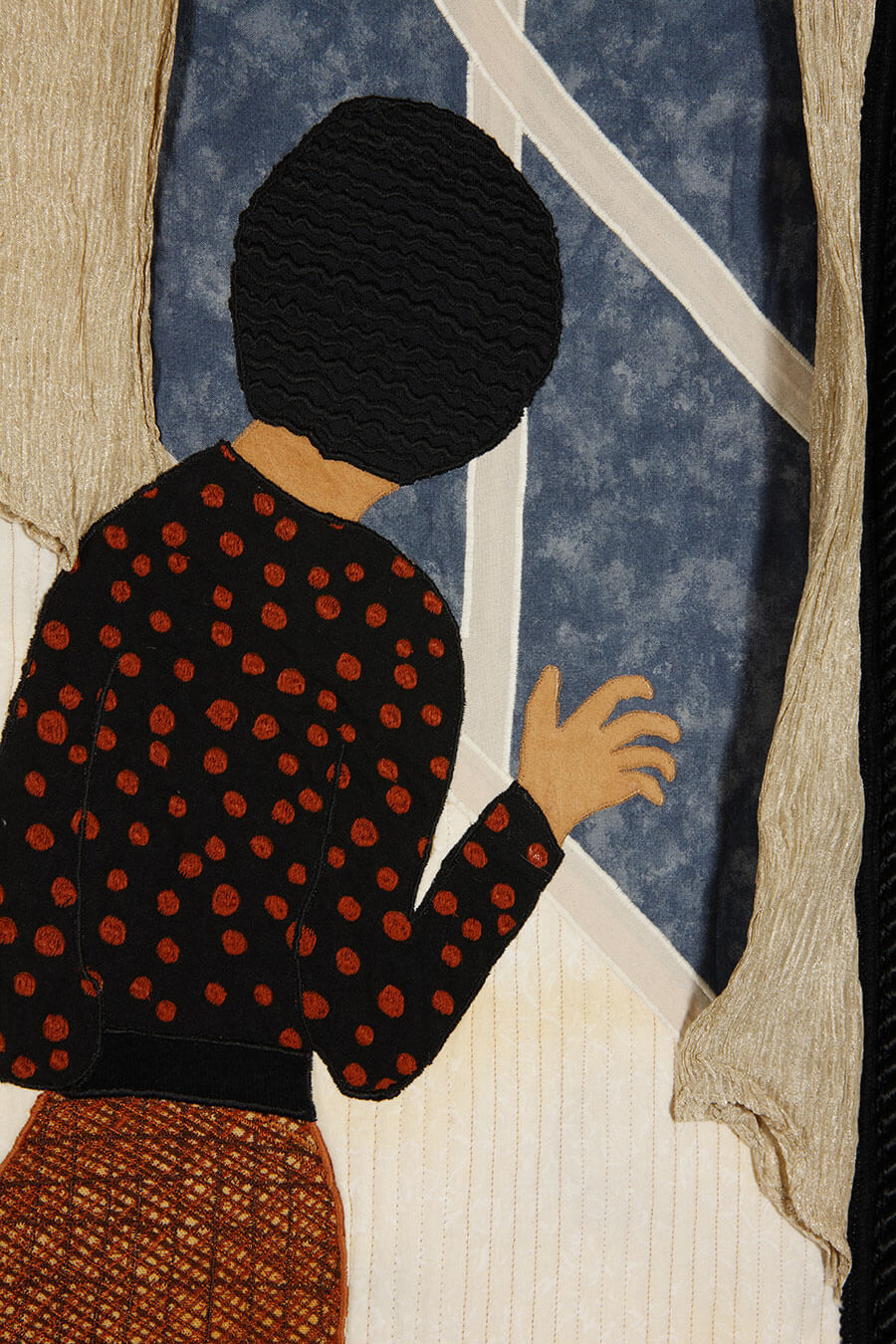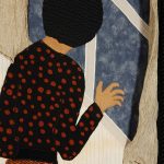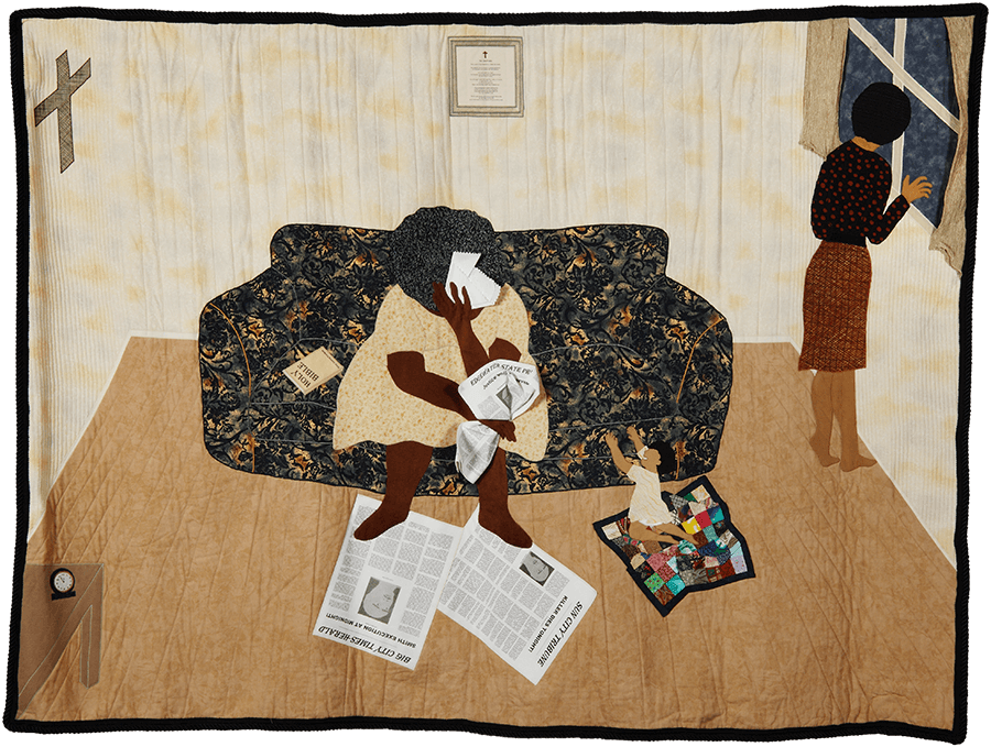 Multilayered in technique and meaning, this work depicts the centrality of faith in African American culture. Identified by their profiles and postures as a young woman, a mature woman, and an older woman, the three kneeling figures are iconic for their generational span and for their strength. These three figures, although flat fabrics, are visually contoured with the use of linear work that is an internal echo of the outlines shapes. The cross, with its African-patterned textiles, casts a protective shadow on the trio.