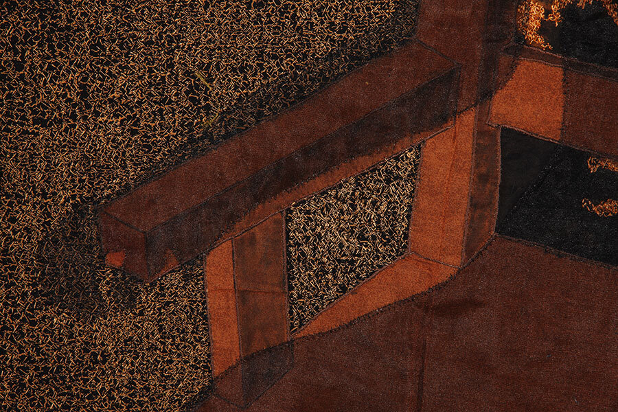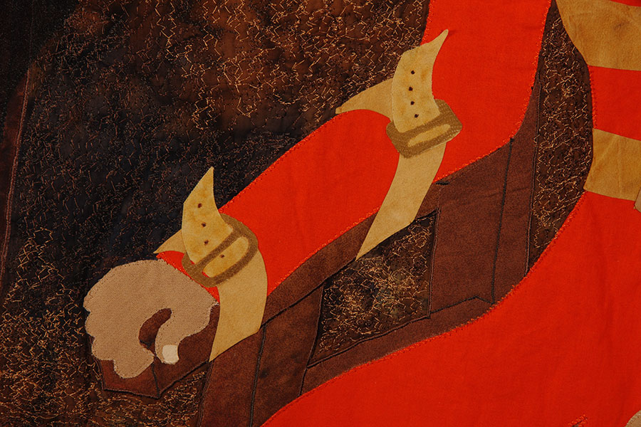 The cross rises from a richly embroidered billow of threadwork in deep and varied reds with gold overlays, a tour de force of surface work. The sheer beauty of this background belies reference to the smoldering and smoking remains of another form of burning cross all too familiar to African American history—another lesson of "the dark past."