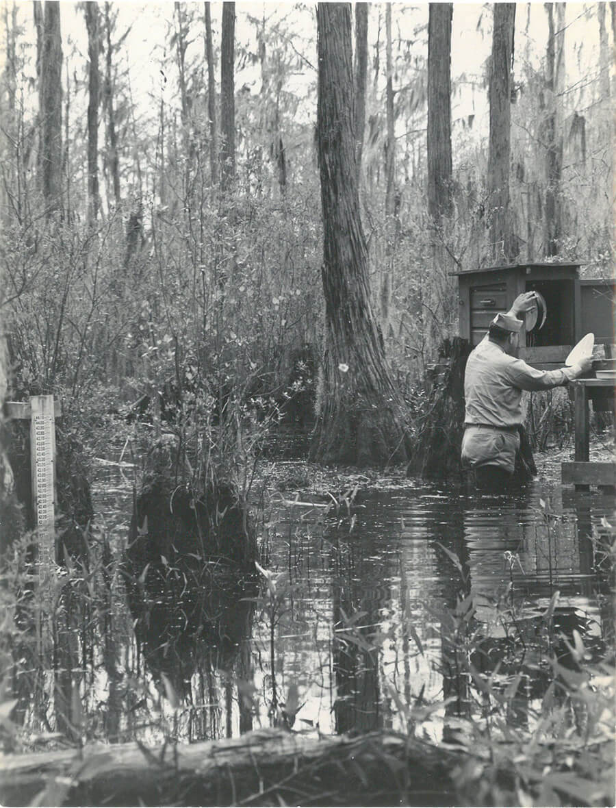 | Mosquito collection, Emory University Field Station on Ichauway Plantation, Baker County, Georgia, ca. 1938–1945. Photograph by United States Public Health Services Office of Malaria Control in War Areas, Melvin H. Goodwin papers, Manuscript, Archives, and Rare Book Library, Emory University. |