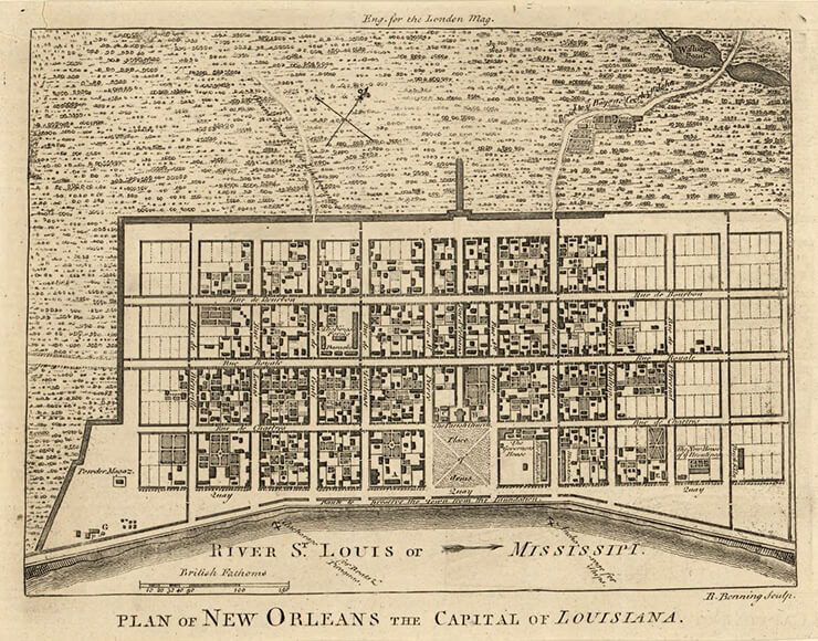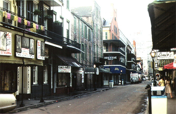 "Origins" reprises Campanella's previous studies on the environmental, topographical, and social conditions that shaped the early cityscape from the French colonial period to the antebellum era. As part of the original urban core, Bourbon Street's relatively high elevation and proximity to the river, the "front of town," made it much more economically and environmentally sound than the flood-prone, low-lying swampy areas of the "back of town" (34). In this period, Bourbon Street also represented the "ironic spatial integration" of New Orleans (36), which, as a major port city and the largest slave market in North America, thrust together a diverse, yet socially stratified population.