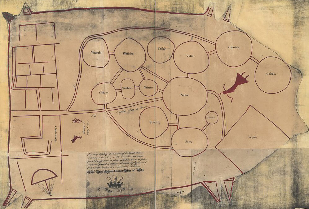 Catawba deerskin map given to colonial govenor Francis Nicholson in 1721. Photograph of original map depicting several nations of Indians native to the northwest of South Carolina. Courtesy of the Library of Congress, Geography and Map Division, digital ID g3860.ct000734.