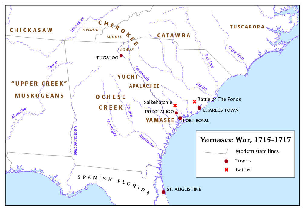 Overview of the Yamasee War. Map by pfly, Wikimedia Commons, June 29, 2007. Creative Commons license CC BY-SA.