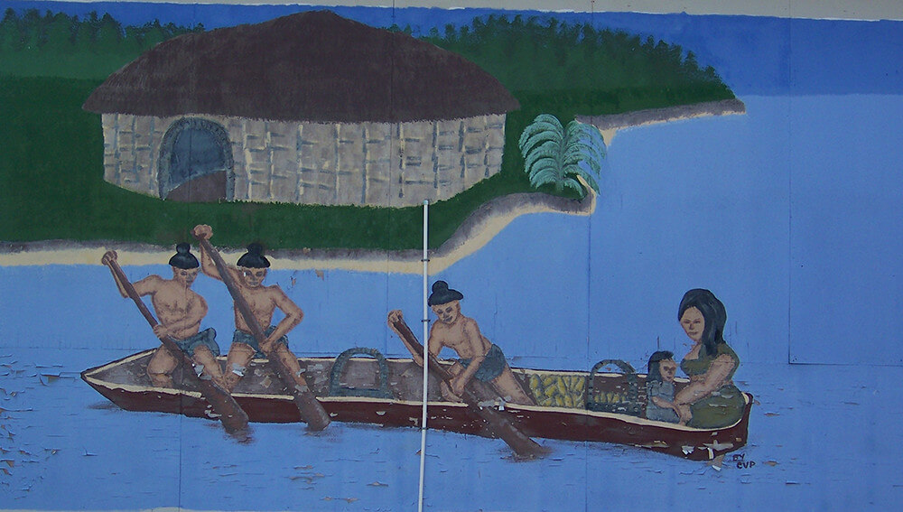 Mural of Yemassee Oarsmen, Yemassee, South Carolina, January 11, 2007. Photograph by Flickr user denseatoms. Mural depicts the Yamassee Indians' distinctive paddling method. Creative commons license CC BY-NC.