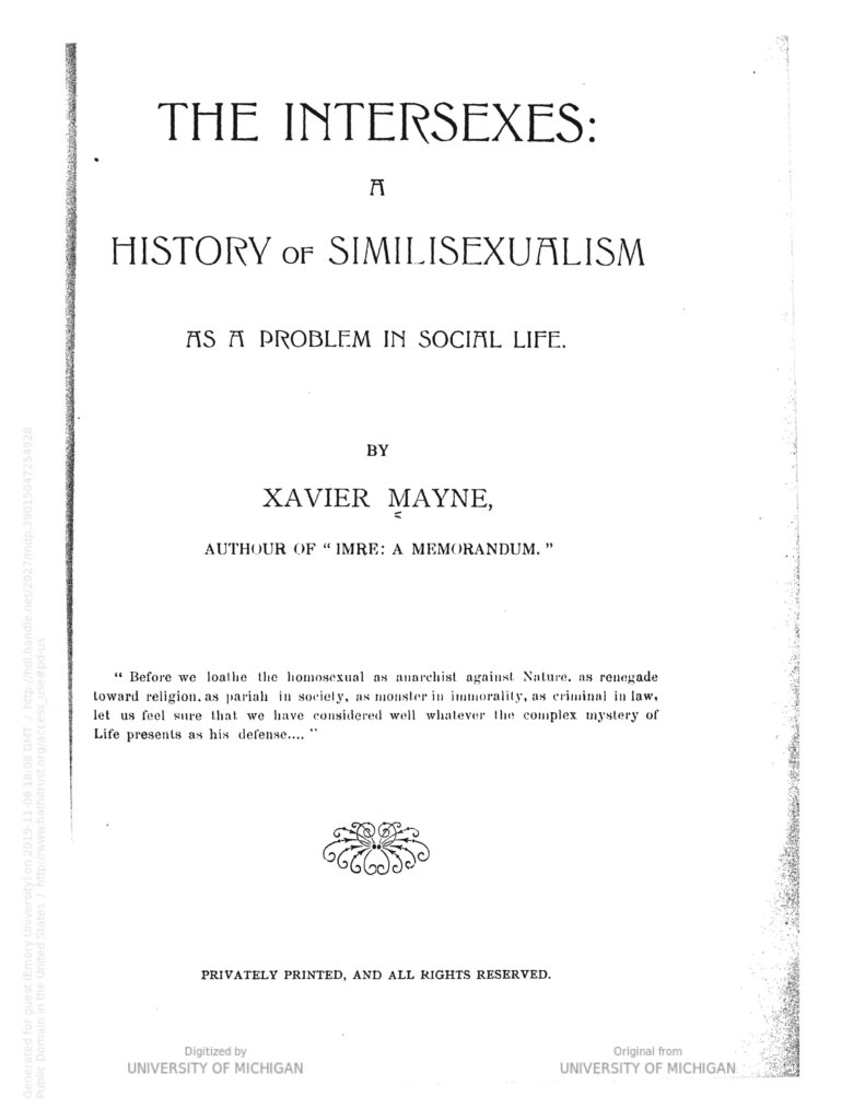 | 6. | Xavier Mayne, The Intersexes: A History of Similisexualism as a Problem in Social Life (Privately Printed, 1908), 86, https://catalog.hathitrust.org/Record/002080887. |