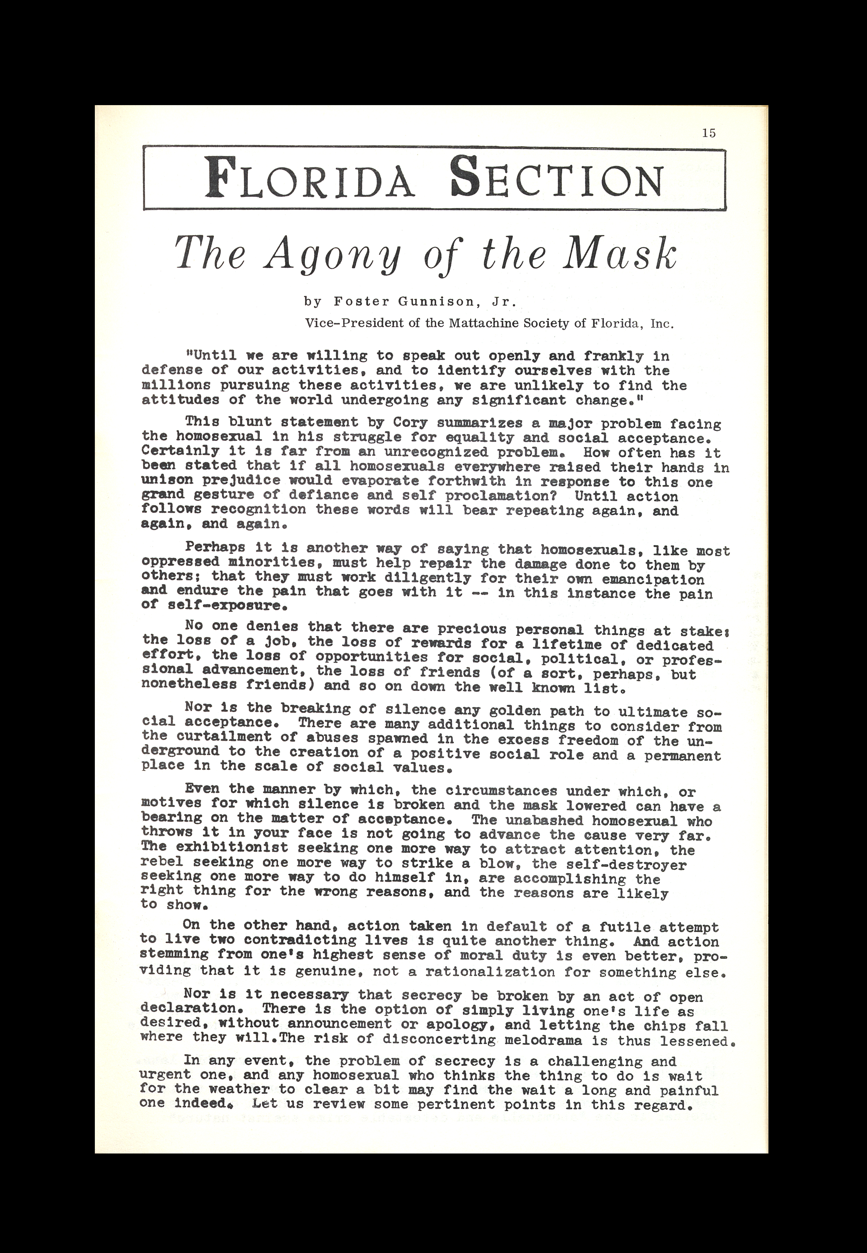 Yet, the pages of homophile periodicals also espoused calls for decoding. The Mattachine Review's September 1958 issue featured the article "Discard the Mask," which in its very title gave the movement an ethical imperative. ONE Magazine featured similar stories, "Homosexuals Without Masks" (November 1958) and "The Tragedy of the Masks" (February 1959).12See Craig M. Loftin's work for deeper critical insight and overviews of much of this ONE Magazine material; Loftin, Masked Voices: Gay Men and Lesbians in Cold War America (Albany, NY: SUNY Press, 2012); Loftin, ed., Letters to ONE: Gay and Lesbian Voices from the 1950s and 1960s (Albany, NY: SUNY Press, 2012). In one of the era's most direct but lesser known homotextual calls for unmasking, Foster Gunnison, Jr., listed as vice-president of the Mattachine Society of Florida, wrote of "The Agony of the Mask" in a 1966 story published in short-lived D.C. homophile periodical The Homosexual Citizen: "Secrecy destroys self-identity . . . To attempt two lives in two worlds at once and still emerge whole would seem to be well beyond the adjustment capabilities of most persons . . . 'The trouble is that for the work's sake you must wear the mask.'"13Foster Gunnison, Jr., "The Agony of the Mask," The Homosexual Citizen 1, no. 4 (April 1966), Don Kelly Collection in Gay Literature and Culture, Cushing Memorial Library, Texas A&M University. In this latter quote within the quote, Gunnison is relating to his readers the feelings of a clergyman who wrote to him and, as Gunnison writes, "shall remain anonymous." Again, the imperative of secrecy and anonymity especially when confronted with the realities of economic survival.14For an overview of Gunnison's papers, see Charles McGraw, "Archives and Sources: The Papers of Foster Gunnison, Jr, and the Politics of Queer Preservation," History Workshop Journal, no. 65 (2008): 179–187.