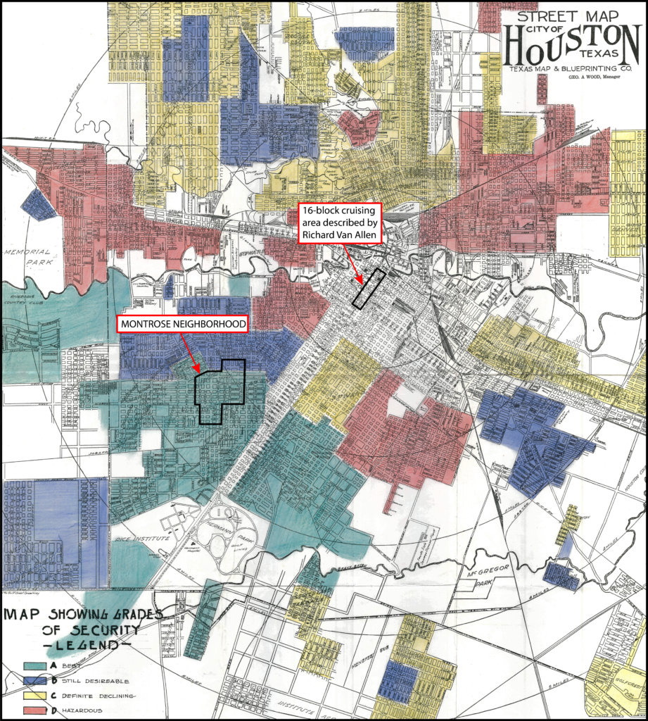 A striking way to situate this "window-shopping" area and the Montrose neighborhood in relation to the rest of 1930s Houston is to superimpose them on a now infamous Home Owners Loan Corporation map from the same era (see map above). The areas shaded red indicate the "hazardous" parts of town, where Black residents tended to live, and where the Home Owners Loan Corporation would not insure mortgage loans. The Montrose neighborhood, some two decades old at the time of this map and mostly shaded green, was the "best" type of neighborhood in which to live. Situated at the city's commercial core, the sixteen-block cruising area Van Allen's article described may well have provided opportunities for same-sex contact across both class and racial lines. And yet, Van Allen's narrators never mark race in their stories. The redlining map suggests at least one explanation for that absence, one that complicates any quick analogy to the kind of racial mixing found in Espinoza's memoir: the opportunistic use of public and semi-public spaces for cruising relied on an appearance of respectability that accounted for the persistence of racial as well as sexual lines in Jim Crow Houston.