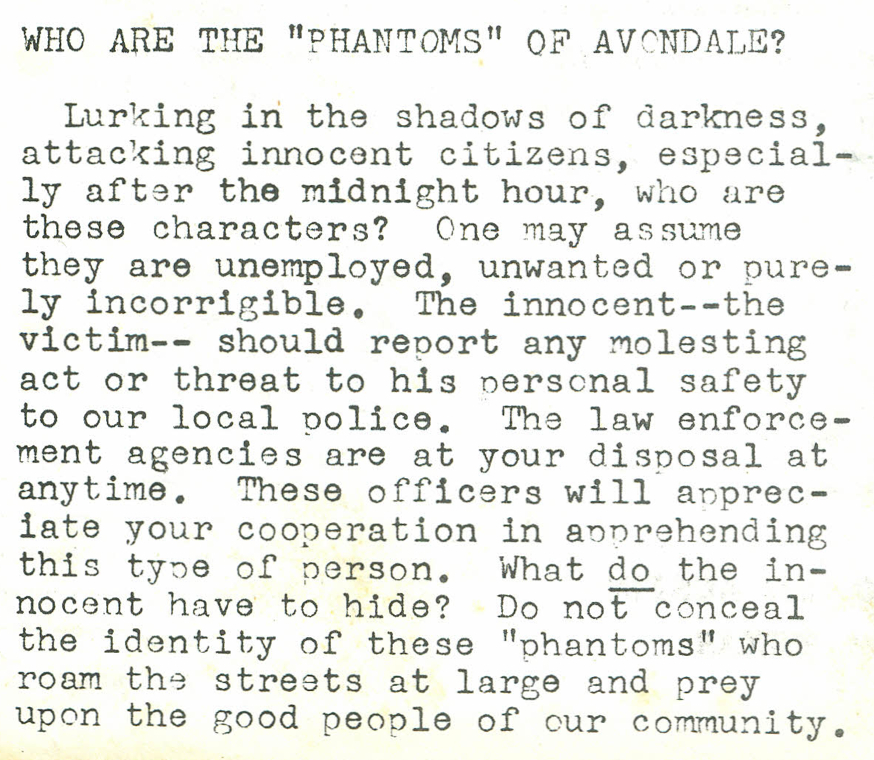 By 1965, three bars had also opened near the Avondale area: Numbers on California, the 900 Club on Lovett Boulevard, and the Round Table on Westheimer. Business owners and newspaper editors whose livelihoods depended on steady commerce likely also understood that the safety of their customers ("the good people of our community") was a prerequisite for their reliable patronage: all the more incentive for Bob Eddy—owner of Houston's Showboat and editor of The Albatross— to launch his paper with the "phantoms" as front-page news.
