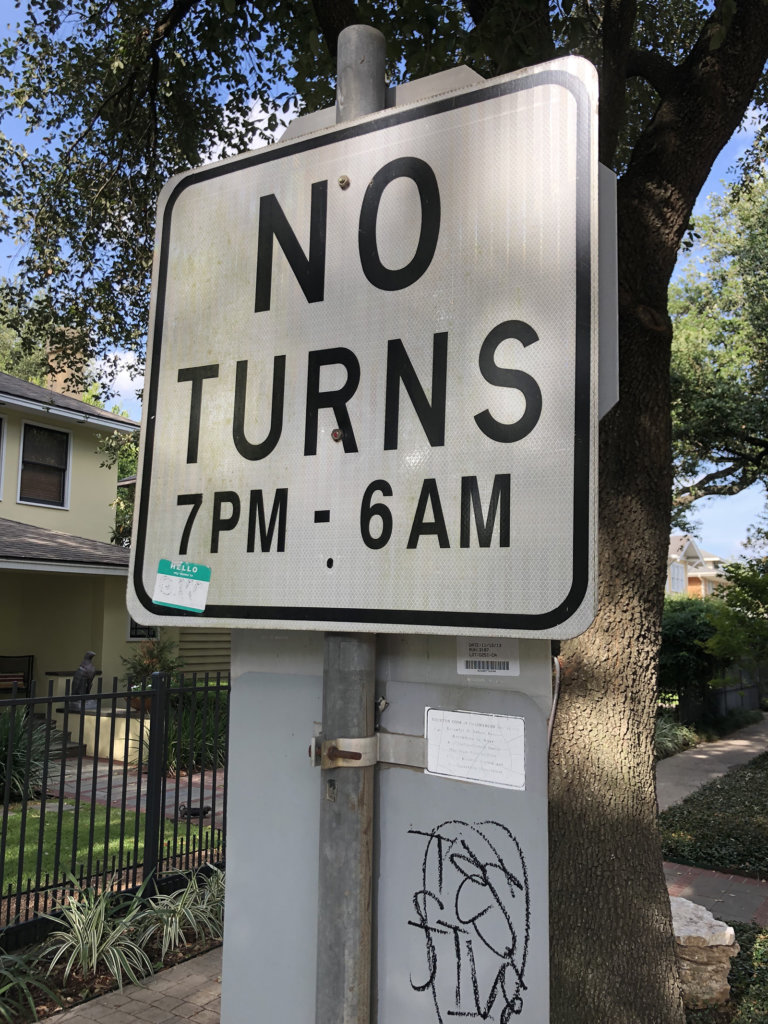 TWT readers were eager to share their thoughts in return. Bill Jackson wrote: "My apartment manager is, I believe, president of the homeowners association. I know, based on a conversation with him last fall, that they think anyone walking in the evening is soliciting, if not selling it."75Bill Jackson, "Letter to the Editor," This Week In Texas 11, no. 48 (February 14–20, 1986): 21. http://www.houstonlgbthistory.org/Houston80s/TWT/1986/86-021496.compressed.pdf. For his part, Don Buch argued that no-turn signs "demean and cheapen our Montrose properties and do not address the 'cruising' problem. It is in fact just a political tool for Houston police."76Don Buch, "Letter to the Editor," This Week In Texas 11, no. 48 (February 14–20, 1986): 23. As of this writing, some of the no-turn signs remain: two at the intersection of Marshall and Graustark, and nine along Roseland and Stanford streets. Despite consistent efforts from a variety of forces, the Montrose cruising circuits remained resilient.