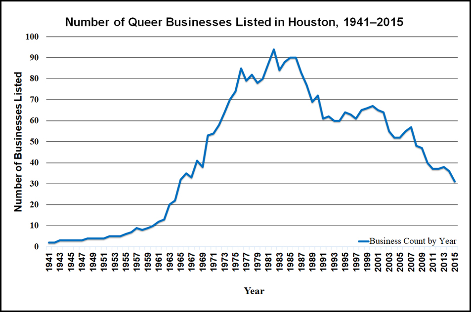 | 11. | The definition of "queer business" here deserves some nuance. The database captures businesses explicitly marketed to a queer clientele. Historical queer advertising usually depicts that clientele as gay men and lesbians, often but not always as separate populations rather than a single market. Businesses were included in the database if they advertised in a Houston-based publication aimed at a queer readership or appeared in a national directory such as Damron's Address Book. This is not to say that queer community owned each business or that queer community was the only clientele. This nuance also matters when thinking about the relationship of cruising to commercial space, whether or not that commercial space can be thought of as queer. |
