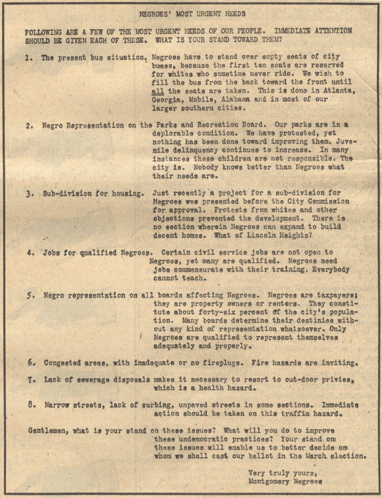 Struggles over segregated space that highlighted injustices offer some of the clearest examples of unacknowledged environmentalism. When the Montgomery Improvement Association (MIA) campaigned to desegregate the bus system and open jobs to black citizens in Alabama's capital city, five of the organization's eight primary demands presaged environmental justice themes. Laid out in a flyer entitled "Negroes' Most Urgent Needs," the MIA's concerns included "Negro Representation on the Parks and Recreation Board," "Sub-division for housing," "Congested areas, with inadequate or no fireplugs," "Lack of sewage disposals makes it necessary to resort to out-door privies, which is a health hazard," and, "Narrow streets, lack of curbing, unpaved streets in some sections."7"Negroes' Most Urgent Needs," Inez Jessie Baskin Papers, Alabama Department of Archives and History, Montgomery, Alabama, as displayed at the Birmingham Civil Rights Institute, http://digital.archives.alabama.gov/cdm/ref/collection/voices/id/2019. All are urban matters that would today be regarded as environmental concerns.