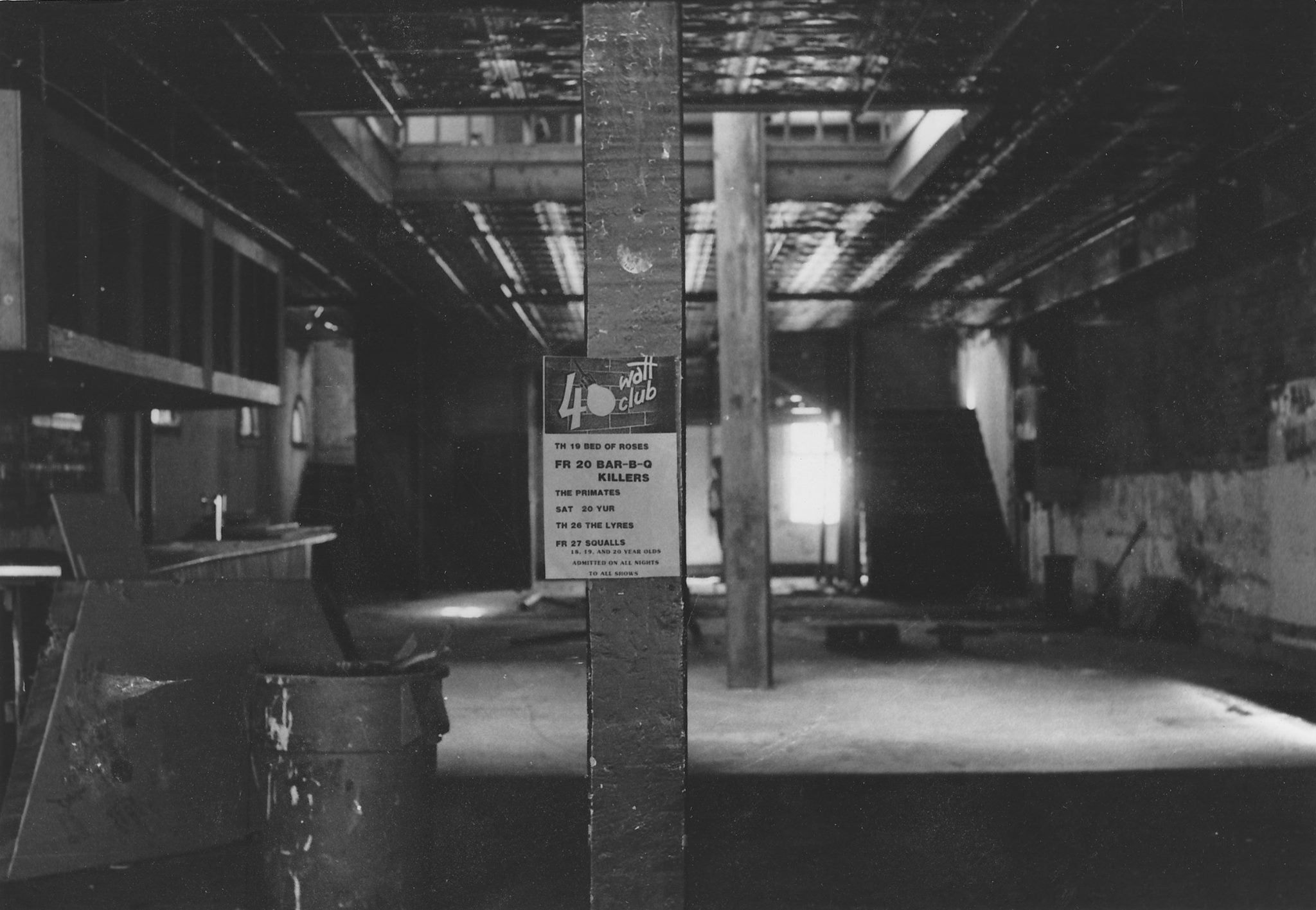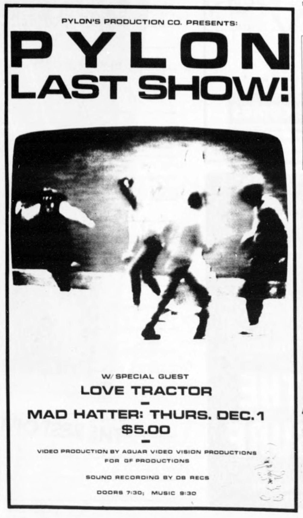 In January 1983, Briscoe Hay told the Athens Observer, "I think if it ever became miserable, we would just disband," and in retrospect she was hinting at what was to come. Band members decided around this time to break up at the end of the year, after they fulfilled their bookings, but they kept their decision secret. In Athens, most people found out when posters went up for "Pylon's Last Show" with opening act Love Tractor. The gig took place in a huge venue known more for its cheap drink nights than live music so everyone could come.14Poster reproduced as an ad, Red and Black, December 1, 1983, 6; Lachowski, interviews; Briscoe Hay, interviews.