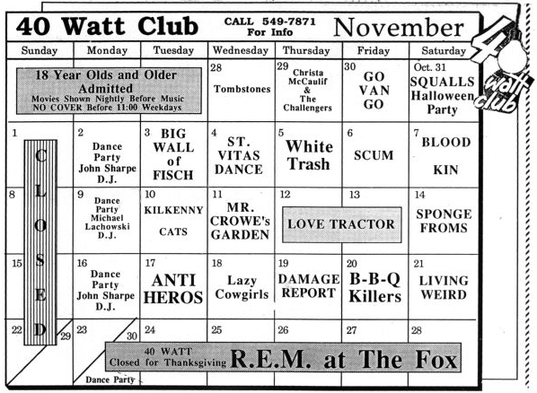 In contrast, the New York-based B-52s hit something of a slump. After following up their debut album with 1980's successful Wild Planet, the group finally released Mesopotamia in early 1982, a David Byrne–produced recording that ended up being an EP because the band simply did not have enough new material. Most critics panned it. New York Rocker captured the prevailing sentiment: "This best-dressed act doesn't know what to do for an encore." Still, a lot of Athens folks headed down to Atlanta to catch the B-52s at the Fox, and Fred Schneider plugged his friend Jerry Ayers's band Limbo District, playing later that night at the Atlanta club 688. The next spring, the B-52s released Whammy!, a new album that returned to their original sound and did better commercially than the EP without generating any hits.12Cindy Wilson interview; Jon Piccarella, "The B-52s, Mesopotamia (Warner Brothers)," New York Rocker, April 1982, 43; J. Eddy Ellison, "Athens Own B-52s Rock the Fox, Still Have Their 40 Watt Charisma," Red and Black, May 12, 1982, 2. Of course, the B-52s never played the 40 Watt Club.