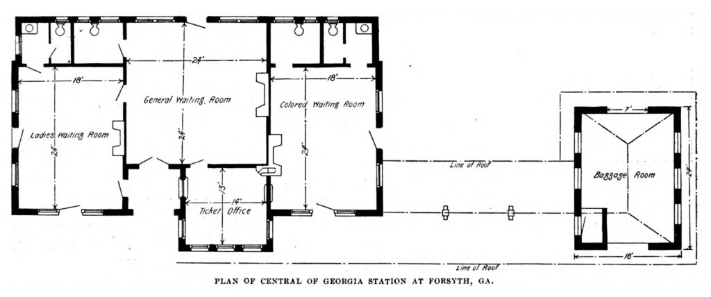 Although far larger than most southern railway stations, Atlanta's Terminal Station was not unusual in its design. Most stations built during the segregation era routed Black travelers through separate entrances. Completed in 1899, Forsyth Station, also in Georgia, was typical in its design. Its small colored waiting room was completely cut off from the rest of the station. It had a front door that opened directly onto the street, and a side door through which Black passengers could access the tracks, but no door connecting it to the station's main waiting room. The only space the station's Black travelers shared with their white counterparts was the station's ticket office, which had a ticket window that opened into the station's colored waiting room.