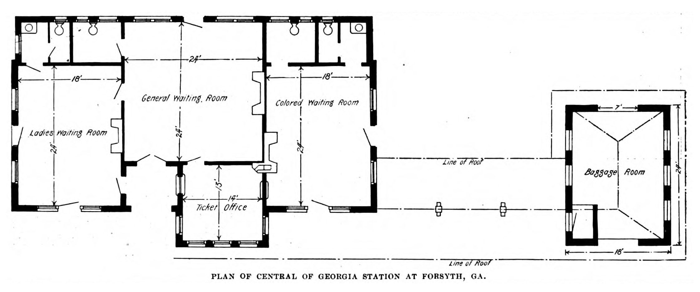 Although far larger than most southern railway stations, Atlanta's Terminal Station was not unusual in its design. Most stations built during the segregation era routed Black travelers through separate entrances. Completed in 1899, Forsyth Station, also in Georgia, was typical in its design. Its small colored waiting room was completely cut off from the rest of the station. It had a front door that opened directly onto the street, and a side door through which Black passengers could access the tracks, but no door connecting it to the station's main waiting room. The only space the station's Black travelers shared with their white counterparts was the station's ticket office, which had a ticket window that opened into the station's colored waiting room.