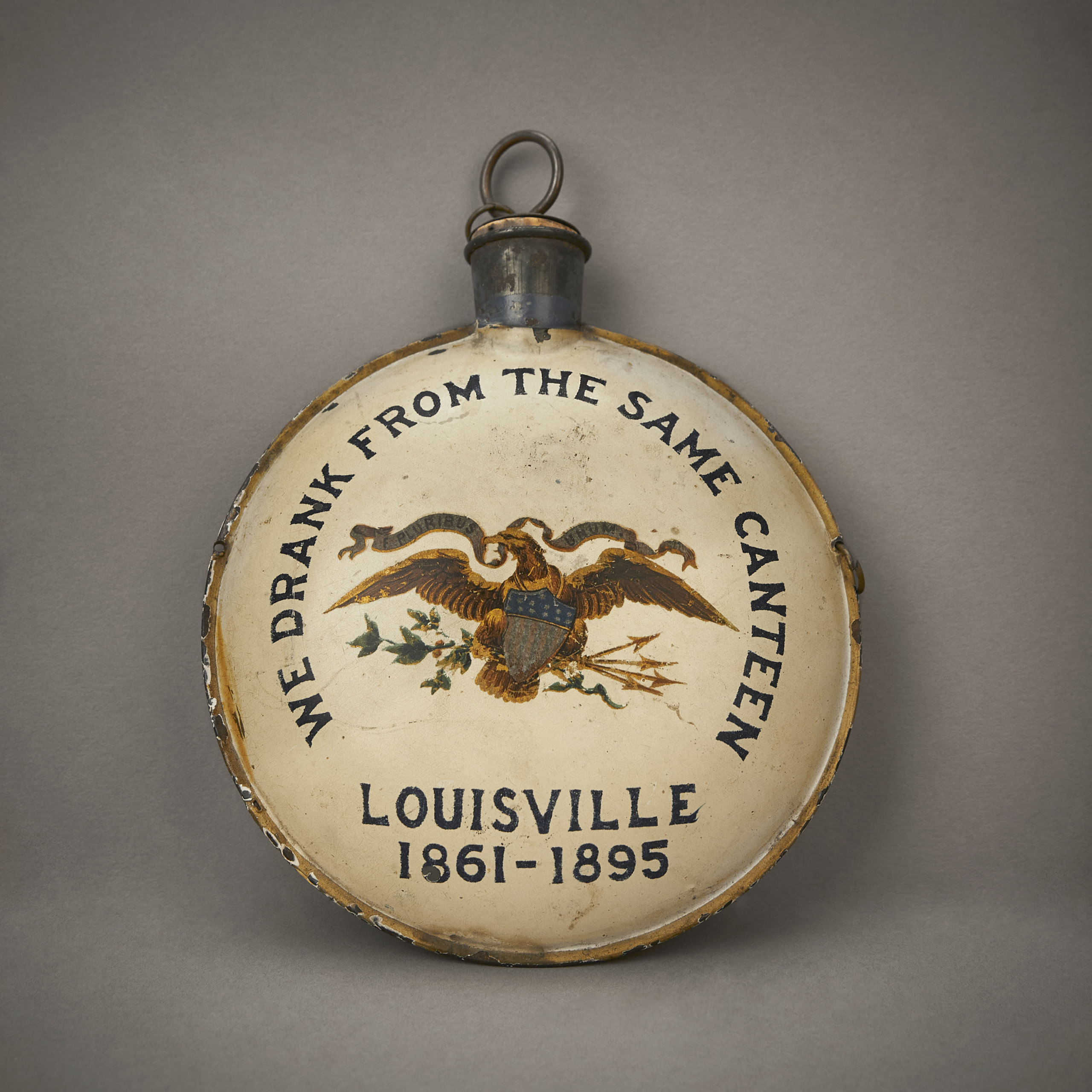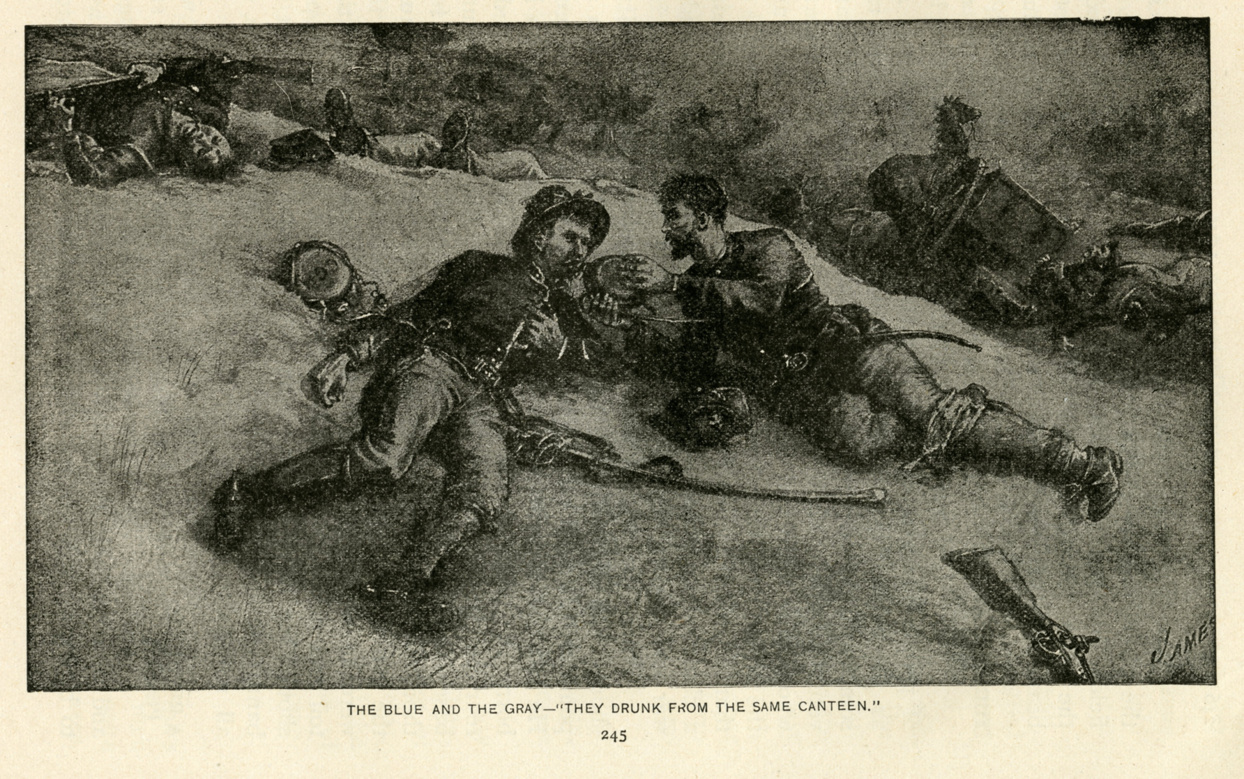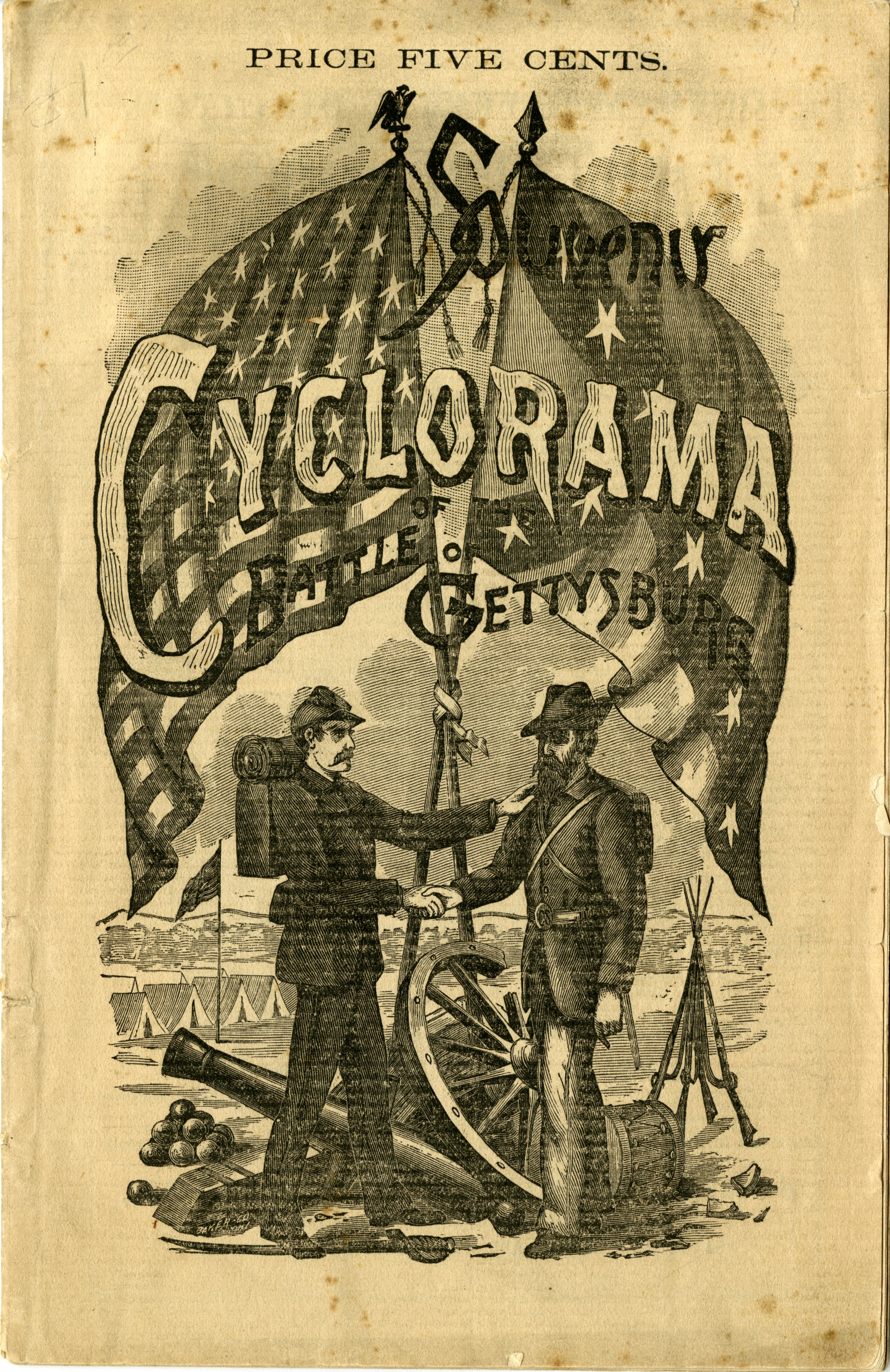 The Civil War battle scenes on sprawling paintings expressed the increasingly dominant narrative of national belonging that encouraged audiences to transcend sectionalism and coalesce around a common white identity.76Jimmy L. Bryan, "Introduction," in The Martial Imagination: Cultural Aspects of American Warfare, ed. Jimmy L. Bryan (College Station: Texas A&M University Press, 2013), 1–11. Vivid, smaller-scale versions of this panoramic theme, included on the canvases themselves or accompanying souvenir programs, cast a spotlight on comradery and common Americanness. In their painting, the Atlanta panorama artists foreground a poignant depiction of a Union warrior sharing his canteen with a wounded Confederate soldier. This image of battlefield magnanimity amid the chaos of combat illustrated the possibilities for intersectional, postwar harmony. The emotionally compelling connection between erstwhile enemies, legendarily siblings who rediscovered each other under dire circumstances, represented in a condensed, visual form the four years-long "brother's war" and the opportunity for reunion of a national "family." Canteen sharing with foes or friendly troops suggested a common humanity or, in other words, "white male unity," as historian Lauren K. Thompson points out in her study of soldier fraternization during the Civil War.77Lauren K. Thompson, Friendly Enemies: Soldier Fraternization throughout the Civil War (Lincoln: University of Nebraska Press, 2020), 154. In another emblematic and evocative image, a souvenir program for the Gettysburg cyclorama depicted soldiers from the two sides clasping hands. This oft repeated symbol of mutual respect and sectional affinity expressed in a single gesture an underlying bond between white, wartime opponents that gained new cache in the century's final years. In the century to come, the images of canteen sharing and hands clasping also served as visual and thematic through-lines to D. W. Griffith's The Birth of a Nation and other cinematic Civil War narratives.