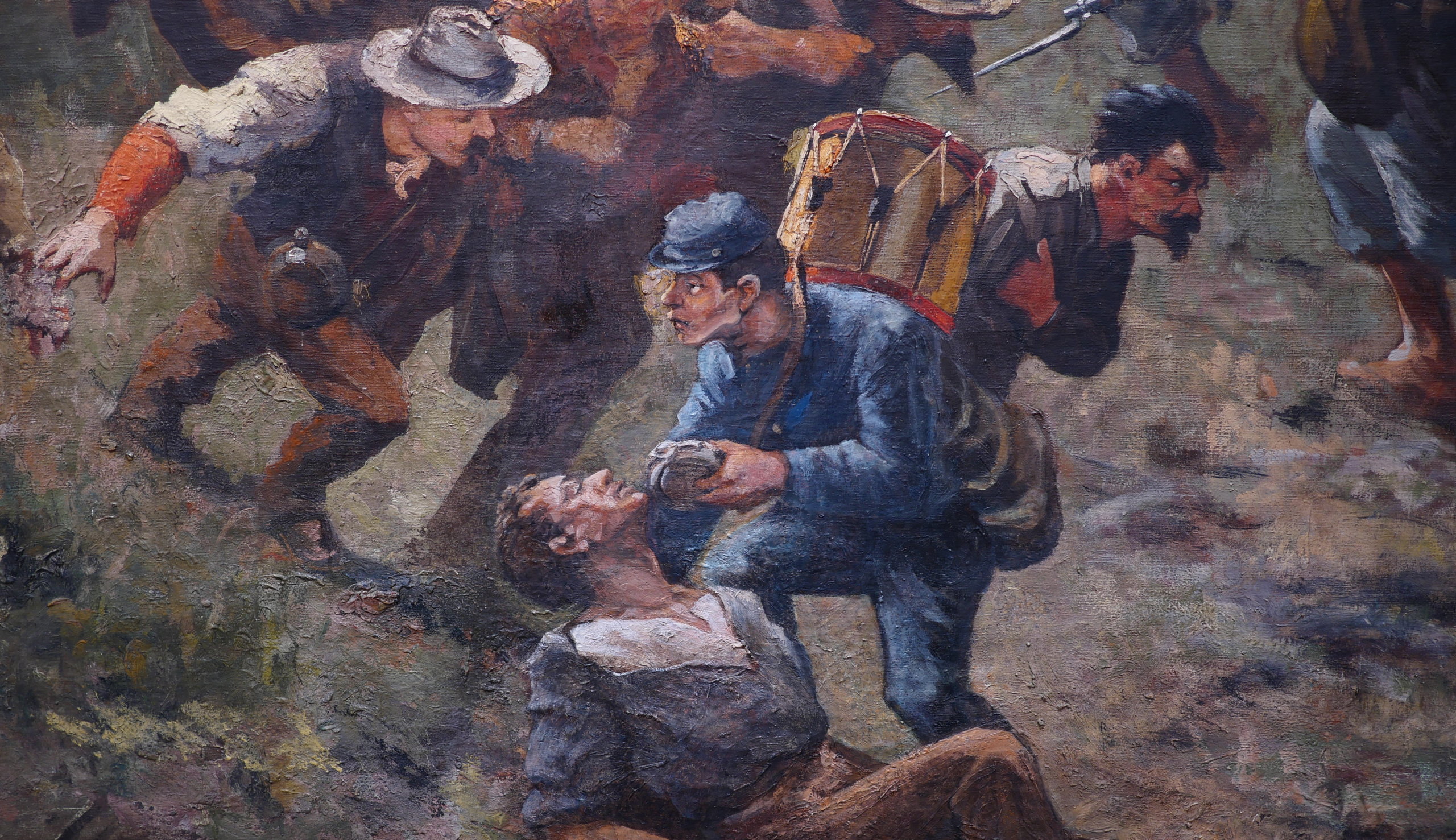Following the break in the US Army's 15th Corps line, Major General John A. Logan, hat in hand and aboard his horse Slasher, is shown galloping toward the battlefront, followed by his staff and a hatless Captain Francis DeGress, whose battery Confederate infantry had captured. Earlier in the afternoon, Logan succeeded Major General James B. McPherson, killed in action, as commander of the Army of the Tennessee, the principal US Army in the Battle of Atlanta. When Confederate attackers broke the 15th Army Corps line, swift action by Logan and other US Army field officers repulsed the Confederate assault and averted a battlefield disaster for the Union army. In his new role as army commander, Logan marshaled reinforcements, summoned artillery support, and rode along the lines of his counterattacking troops, exhorting them with the rallying cry of "McPherson and Revenge."