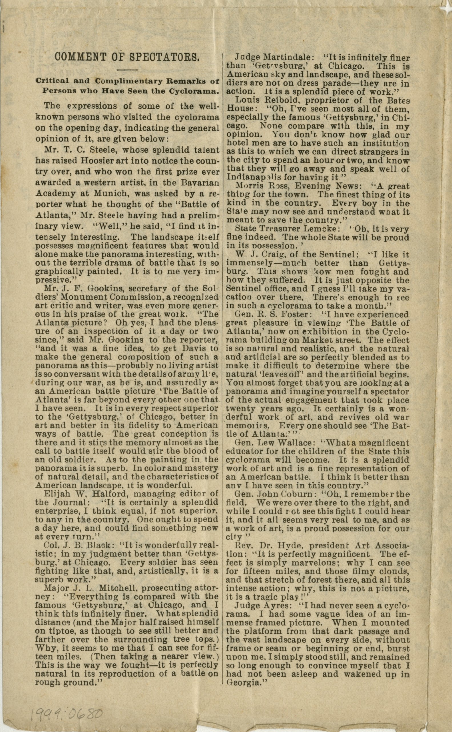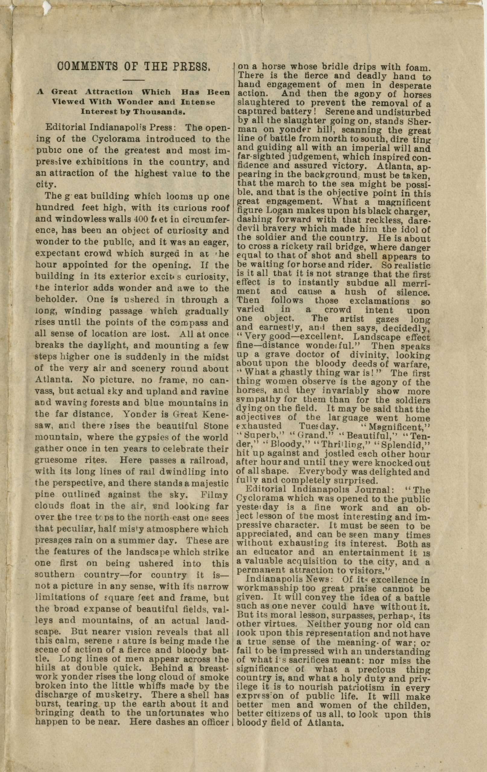 "Indianapolis Cyclorama and the Battle of Atlanta." The Indianapolis Star. July 22, 2017. https://www.indystar.com/videos/news/2017/07/22/indianapolis-cyclorama-and-battle-atlanta/103894462/.