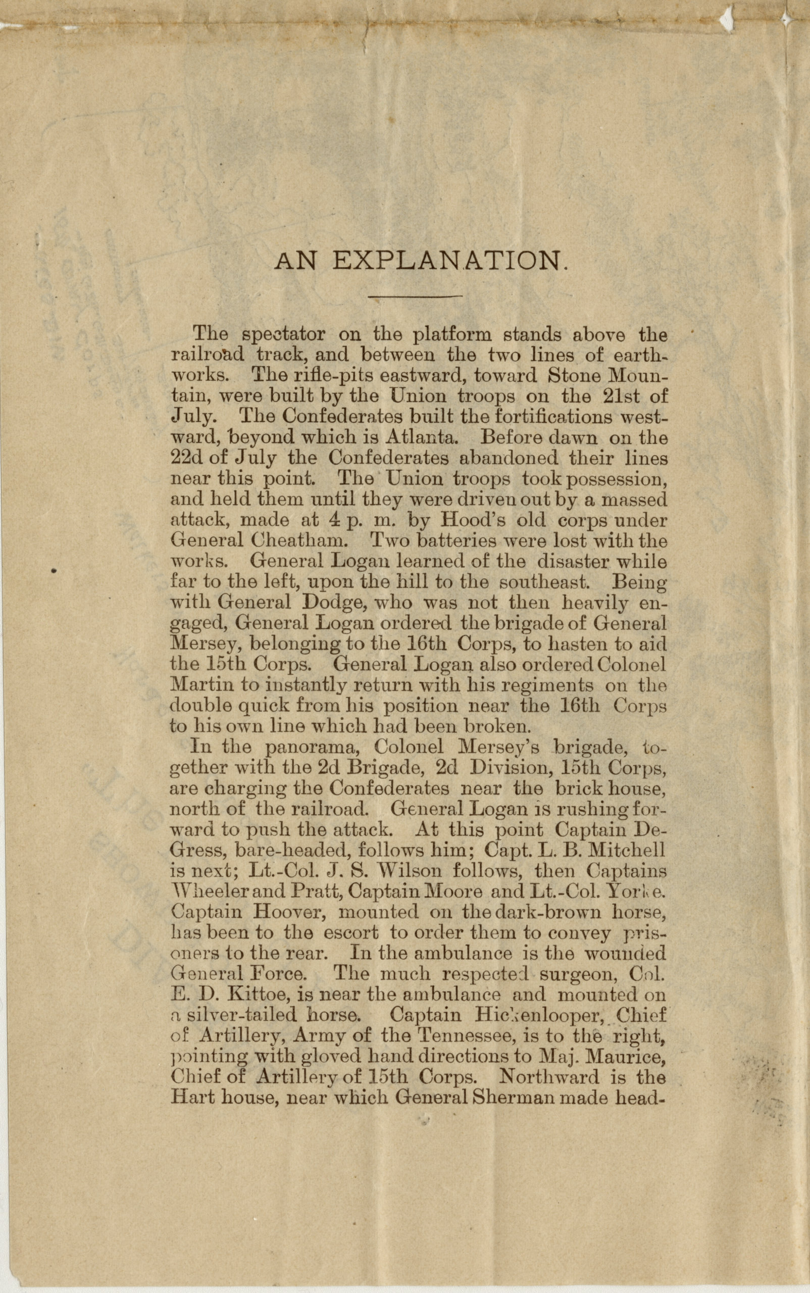 Theodore R. Davis explained in an 1886 article, "How A Great Battle Panorama is Made," that as soon as cyclorama visitors reached the central viewing platform they would seemingly "stand in the midst of a real battle."55Theodore R. Davis, "How a Great Battle Panorama is Made," St. Nicholas 14, no. 2 (1886): 99–112. The simulated, bird's-eye view of the Battle of Atlanta placed audiences just behind the Federal Army of the Tennessee's generals, junior officers, and soldiers and closest to where a hard charging Confederate brigade had broken the Union infantry line at the Troup Hurt House and Georgia Railroad. Federal Major General John A. Logan is shown galloping toward the battlefront, spurring on his troops as they surge forward in a counteroffensive that restores their line and retakes a famed group of cannons, the DeGress battery, that temporarily changed hands. Logan's vivid likeness and his pictorial prominence far surpass the representation of his commanding officer, General William T. Sherman, who is barely visible on a high hill above the battlefield, observing the action below from the grounds of his field headquarters. The Confederate army's commander, John Bell Hood, does not appear in the Battle of Atlanta painting.
