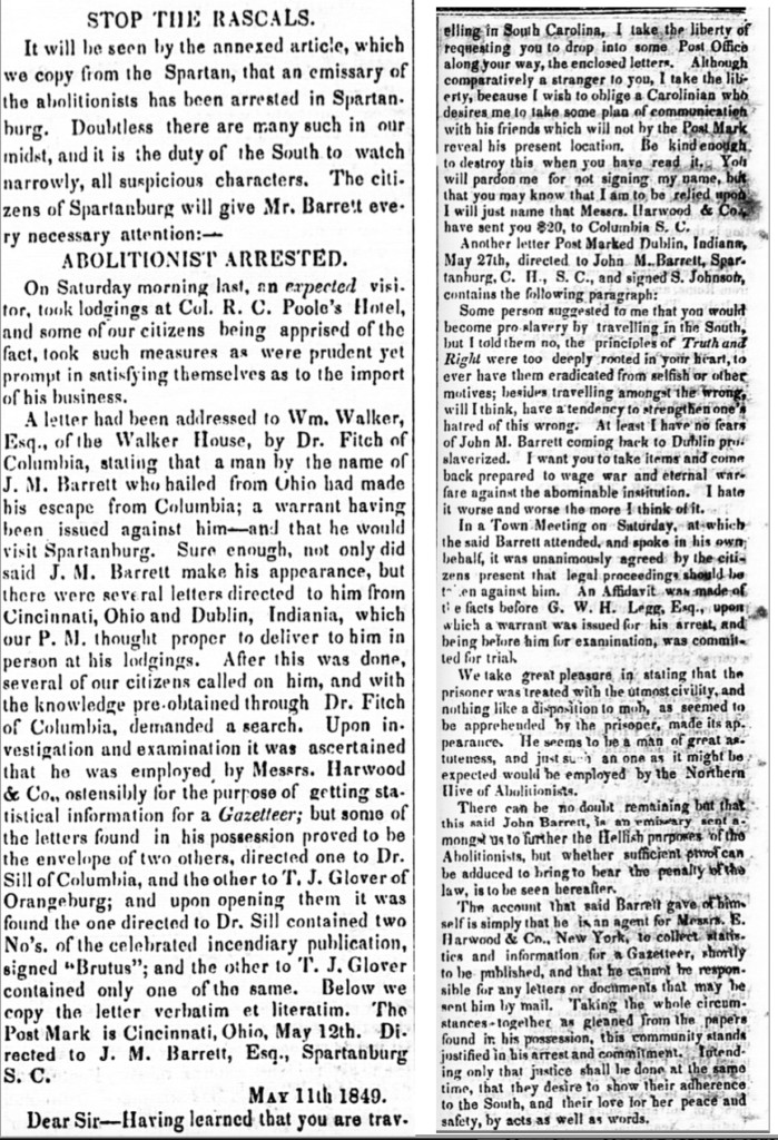 Initially, things seemed to work as intended: post offices across the state received an onslaught of pamphlets. But authorities caught on fairly quickly: first in Columbia, where a warrant was issued for Barrett's arrest. He then turned up in Winnsboro. There he was let loose for lack of evidence.22Morris, "Abolitionist Transformation," 40. Likely in Apil 1849, he made his way through Anderson County and the Pendleton District. When he reached Spartanburg, a letter from Columbia warning that he might make an appearance arrived with local officials. They detained and arrested Barrett when a letter directed to him (under a pseudonym) was found to contain what one paper termed "celebrated incendiary publications."23McNulty, "William Henry Brisbane," 124–5. See also "Abolitionist Arrested," North Star (Rochester, NY), July 20, 1849. Vague and clumsy references to letters in code and cyphers in his correspondence directed to Barrett made his situation look damning. One newspaper from North Carolina noted that if it hadn't been for clumsy cyphers, the entire affair would have seemed quite innocent.24See "Espionage in the Mails," Raleigh (NC) Register, reprinted in North Star (Rochester, NY), October 5, 1849, https://www.loc.gov/resource/sn84026365/1849-10-05/ed-1/?sp=1&r=0.086,0.73,0.275,0.143,0.