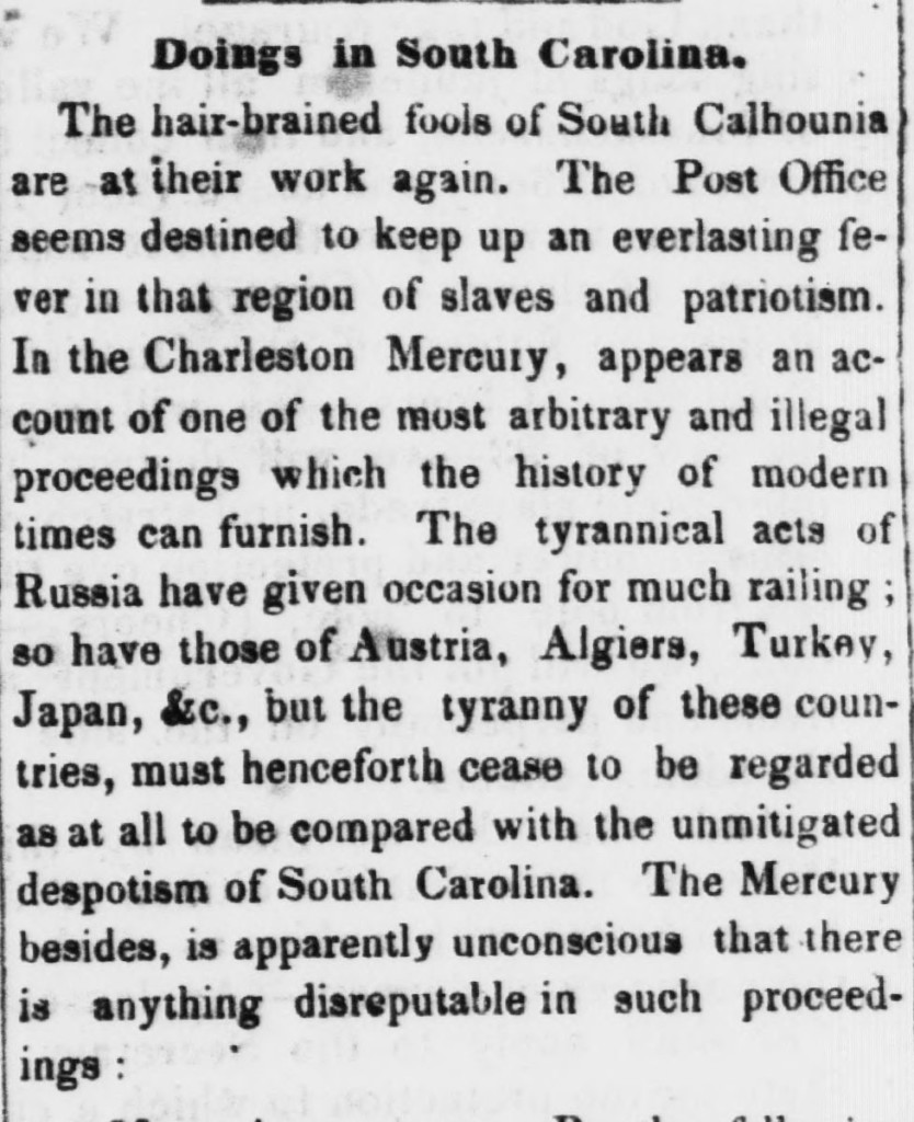 While there were some contrary expressions, on the whole, white South Carolinians followed the story with indignation and increasing fury.33See "Espionage in the Mails" for a conciliatory editorial from North Carolina arguing that mail censorship was a bad precedent. And even though the disseminated materials promoted the Brisbane-style of argument that white non-slaveholders should oppose slavery because it disproportionately empowered elites, several newspapers in southern states assessed this argument as likely to incite rebellions and uprisings among the enslaved. The Charleston Daily Courier wrote: "There can be no doubt remaining but that this said John Barrett, is an emissary sent amongst us to further the Hellish purposes of the Abolitionists."34"Another Letter," Charleston (SC) Daily Courier, June 18, 1849.