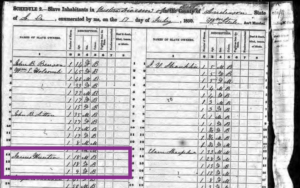 | 63. | "James Hunter," 1850 United States Census (Slave Schedule), Anderson County, SC, NARA series M432, Roll 861, Family Search, accessed July 25, 2022, https://familysearch.org/ark:/61903/1:1:HRW4-GYN2. |