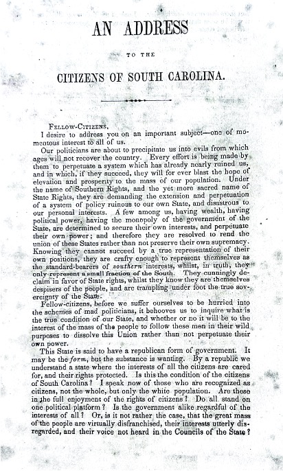 Brisbane began to draft opinions under the pseudonyms of "Brutus," "A True South Carolinian," and other aliases that targeted non-slaveholding white men, particularly those from the inland and upcountry regions of the state (including Pendleton and its adjacent districts and counties)—all areas which featured less dense populations and far less concentrated wealth than was found in the coastal or "Lowcountry" region. The three most northwest counties of the state (Oconee, Anderson, and Pickens—often understood as the "Pendleton District") were perceived as being vulnerable to arguments that might appeal to white citizens feeling unrepresented or disenfranchised by the dominance of the planter politics of the state. Brisbane hoped to win "upstate" or "upcountry" South Carolina citizens over to the antislavery cause by arguing that their own best interests were to resist the political power of the class of elite enslavers and to embrace free labor.15The antislavery pamphlet, "An Address to the Citizens of South Carolina," by "Brutus" circulated in the 1849 campaign (and was actually found with John M. Barrett in Spartanburg). The pamphlet was included in his indictment. State v. John Barrett,