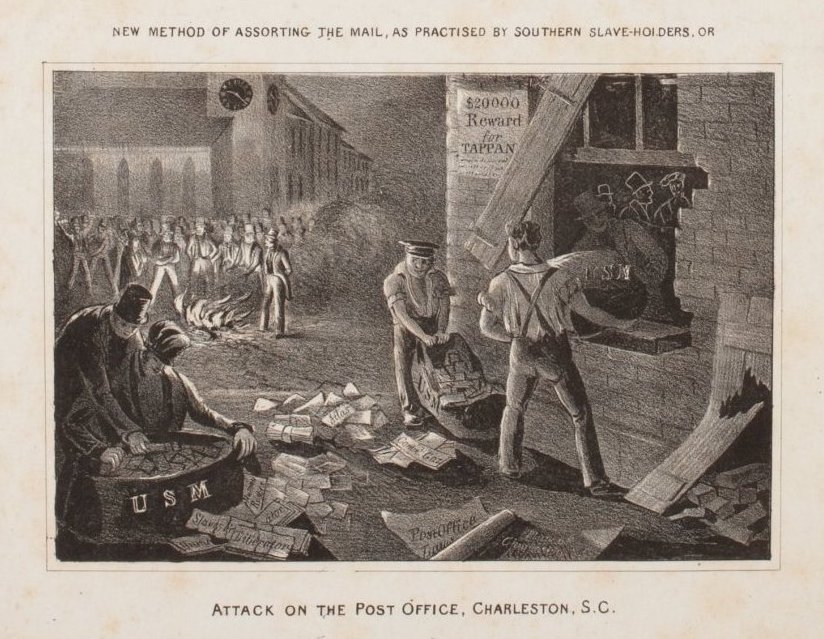 Arthur and Lewis Tappan, a Massachusetts pair of evangelical philanthropists, directed much of their money to activist causes, particularly towards antislavery organizations and endeavors. In 1835, the Tappan brothers funded an extraordinary undertaking: they helped the American Anti-Slavery Society send unsolicited abolitionist messages, newspapers, and tracts to many ministers, prominent business people, and public figures in several states below the Mason–Dixon line. This brash endeavor might well have been, to use the words of one historian, "[a campaign that] sparked the country's first crisis over postal content."5Winifred Gallagher, How the Post Office Created America (New York: Penguin Random House, 2016), 75. See also Richard R. John, Spreading the News: The American Postal System from Franklin to Morse (Cambridge, MA: Harvard University Press, 1998), 257–58.