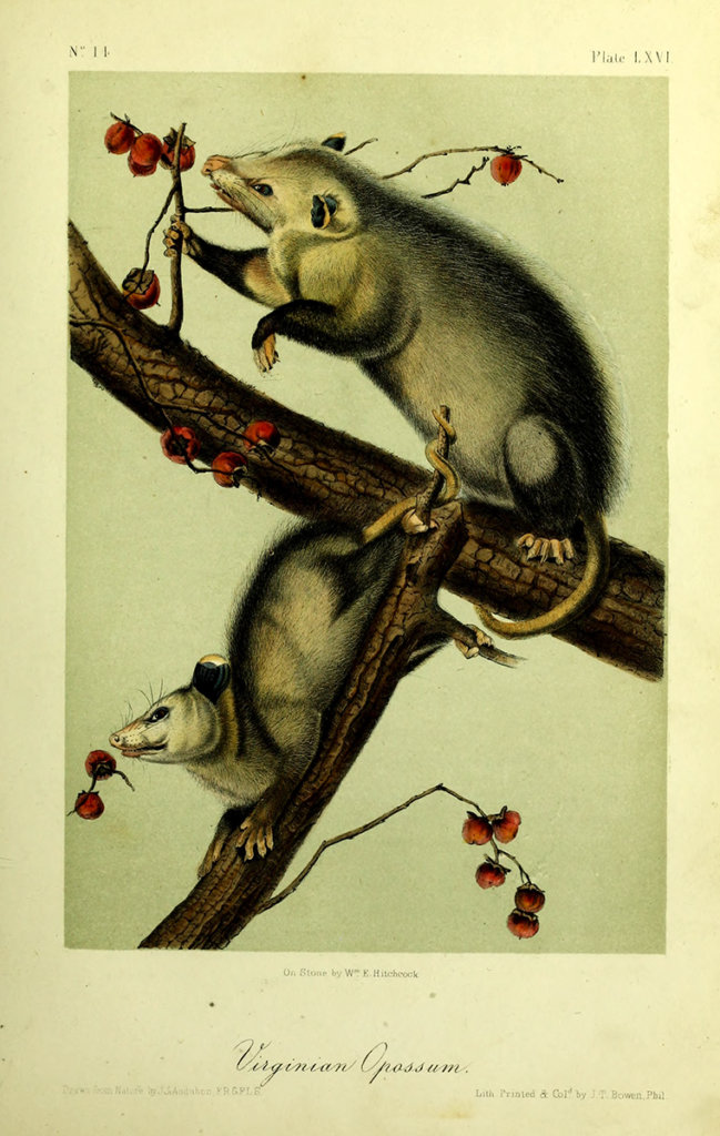 What was the historical geographic range of the Virginia opossum (Didelphis virginiana)? A mid-1950s article by John Guilday indicates an abundant archeological record of the indigenous marsupial in the Lower and Middle Ohio Valley and in Ohio north to the shore of Lake Erie before European colonization.11John E. Guilday, "The Prehistoric Distribution of the Opossum," Journal of Mammalogy 39 no. 1 (1958): 39–43. An absence of remains reveals that the opossum either did not occur or was uncommon in the Appalachian Plateau of northern West Virginia, western Pennsylvania, and southern New York. Guilday shows that species distribution extended beyond the southeastern United States, even though settlers came to associate the opossum with that section of the country. In The Quadrupeds of North America, John James Audubon writes that the opossum was by no means confined to southern states, particularly during the antebellum period. By 1851 the opossum's range extended north to the Hudson River. Audubon believed that populations would soon occupy southern New York and Long Island "as the living animals are constantly carried there."12John James Audubon and the Rev. John Bachman, The Quadrupeds of North America, vol. II (New York: V. G. Audubon, 1851), 124, https://archive.org/details/b22012436_0002/page/124/mode/1up. In New Jersey and Pennsylvania, opossums were common, but they were more abundant southwardly through North Carolina, South Carolina, Georgia, Louisiana and Texas, to Mexico. They also existed in Indiana, Mississippi, Missouri, and Arkansas, and extended to the Pacific, with some populations in California.13Audubon, Quadrupeds, 125.