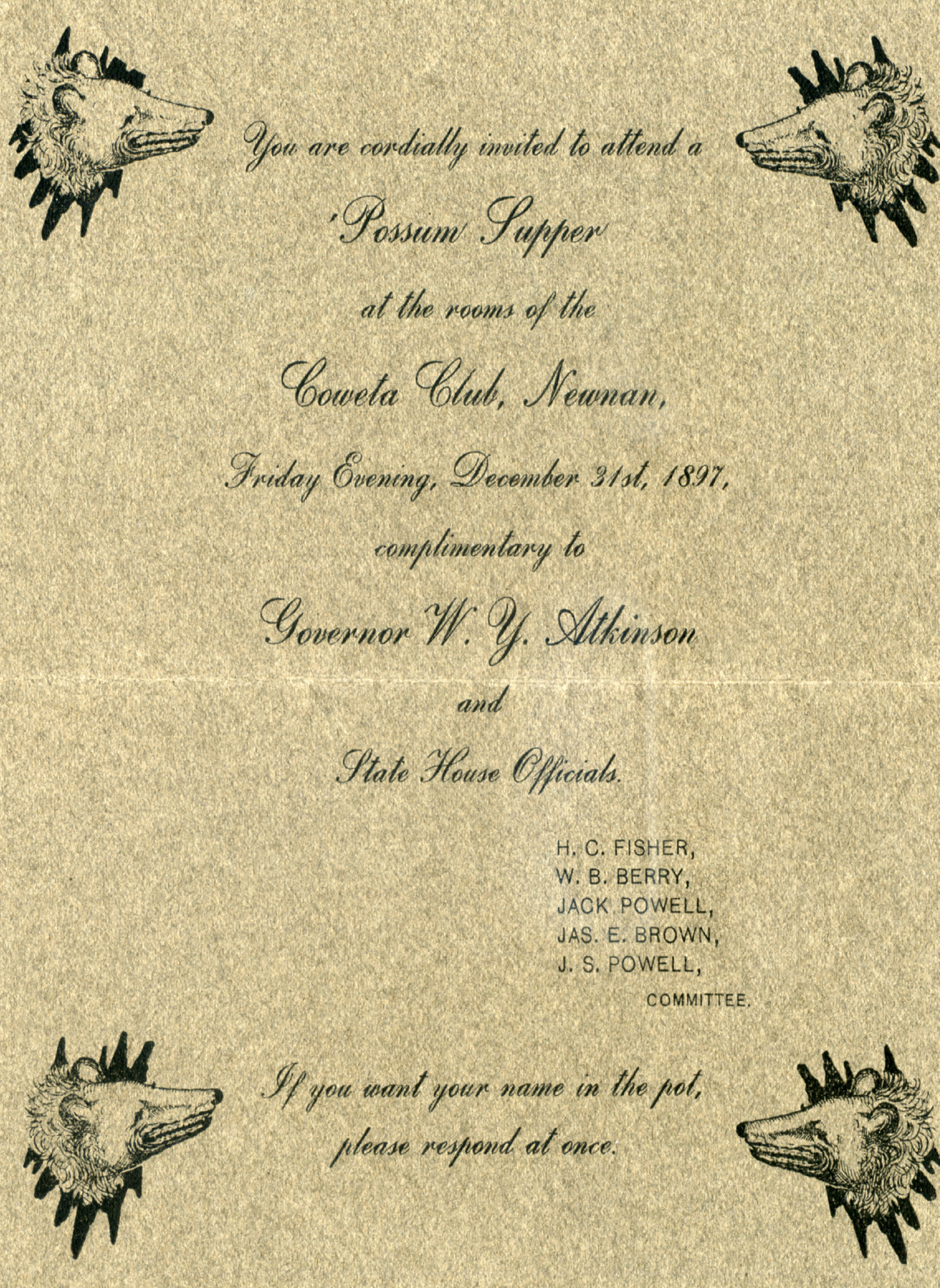 Opossum suppers became an important stage on which political actors could deploy new strategies and solidify networks of accomplices. Beginning in 1894, Colonel Harry Fisher—"railroad man, fertilizer magnate, friend of corporations"—commenced the political opossum suppers of Newnan, Georgia, to advance the Democratic ticket.77"Possum and Politicians: Many Invitations Have Been Sent Out to Newnan's Possum Supper," The Atlanta (GA) Constitution, Dec. 28, 1897, 5, https://chroniclingamerica.loc.gov/lccn/sn86063034/1897-12-28/ed-1/seq-2/. See also "Politicians to Eat 'Possum. The Supper at Newnan to Be a Unique Affair," The Morning News News (Savannah, GA), Dec. 28, 1897, 2, https://chroniclingamerica.loc.gov/lccn/sn86063034/1897-12-28/ed-1/seq-2/. Located about forty miles southwest of Atlanta where many in-state attendees traveled from, Newnan had escaped destruction during the Civil War. Its supper became an annual event, sending out over six hundred invitations "to men of prominence, both inside and outside" of the state. Politicians gathered in anticipation of the official Democratic convention and, while eating opossum, pre-determined the roster of officials for high-ranking positions.