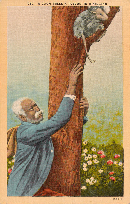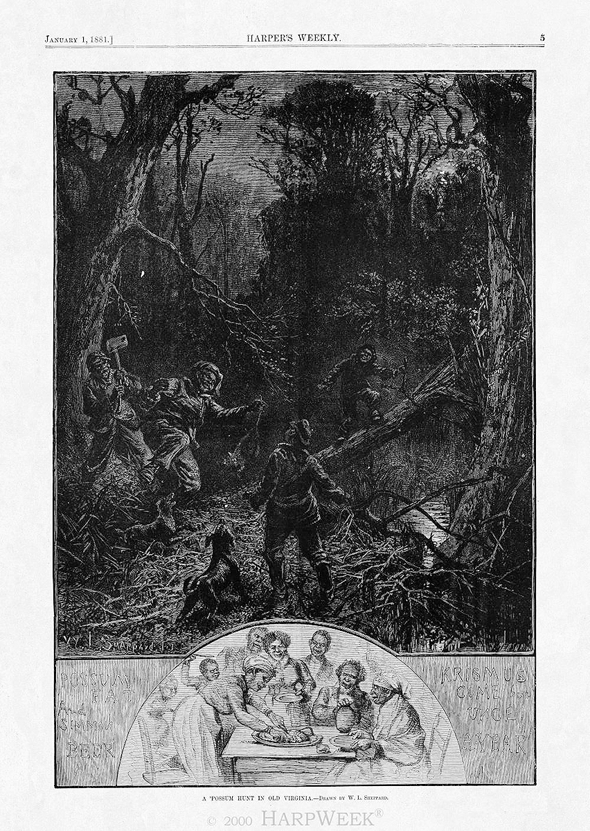 For white men who had grown up on plantations, postbellum Black opossum hunting could evoke conflicting feelings. Sometimes the activity signaled a threat to white supremacy, while other times it featured in an imagined "South." While the Ramapough Mountain Indians of New Jersey and New York engaged in hunting opossums, a New York Times correspondent asserted in 1886 that they were "not such picturesque35"Picturesque" appears frequently in late-nineteenth century writing describing opossum hunting throughout the southern states. The term was rooted in eighteenth-century British landscape design, but travel writers, such as William Bartram, later used it to describe an attractive or pleasing scene. See "Picturesque," (Washington, DC: National Gallery of Art, last edited 2021), https://heald.nga.gov/mediawiki/index.php/Picturesque. hunters as their brethren of the south" because, instead of using hunting dogs, they relied on guns and deadfall traps (even though slaves and freed people in the southern states also used guns and traps).36"Hunting the Possum," Buffalo (NY) Commercial, Sep. 4, 1886, 1; "Hunting the Opossum. A Place Where He Is Found North of Mason and Dixon's Line," Wood County Reporter (Grand Rapids, WI), Sep. 23, 1886, 6, https://chroniclingamerica.loc.gov/lccn/sn85033078/1886-09-23/ed-1/seq-6/. Stereotypical depictions of place and race formed around the native marsupial. "No one ever located the opossum hunt anywhere but in the gum swamps or among the persimmon trees of the south," the correspondent wrote in popular racist imagery, "where they are ever associated with the spectacle of the bulging-eyed and expectant darky carrying aloft his flaming pine-knot torch, while his lean and lanky dog leads him to the tree where the much prized possum has sought refuge." A racist "plantation song" suggests a chaotic scene: