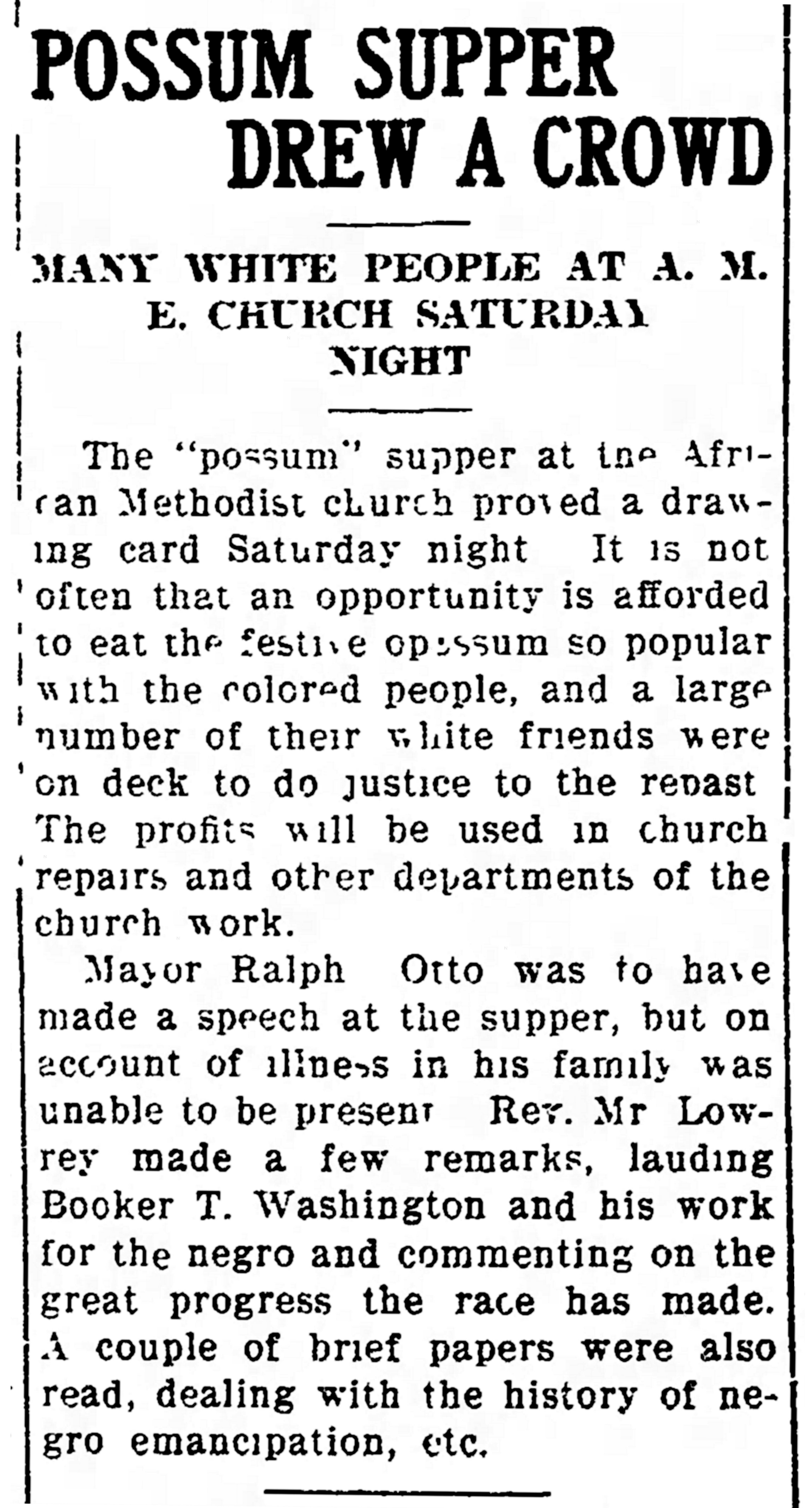 Taft's 1909 Atlanta banquet marked the opossum's peak as a symbol of white supremacy and sectional reconciliation. After Democrats regained their political power and fully achieved Black disenfranchisement, opossum suppers diminished in popularity and, with some exceptions,123For example, the Atlanta Association of Building Owners and Managers hosted an opossum supper for Franklin D. Roosevelt, then Governor of New York, during his visit to White Sulphur Springs, Georgia, in 1930. "Roosevelt Eats and Hunts 'Possum as Georgia Guest: Partakes of Primitive Meal in Role of Adopted Son," New York Herald Tribune, Nov. 30, 1930, 11. its ties with Confederate nostalgia and Jim Crow politics faded from memory. Writing in 1916, the editor of the Jackson News in Mississippi revisited the lore surrounding the opossum, as well as the racist stereotypes:
