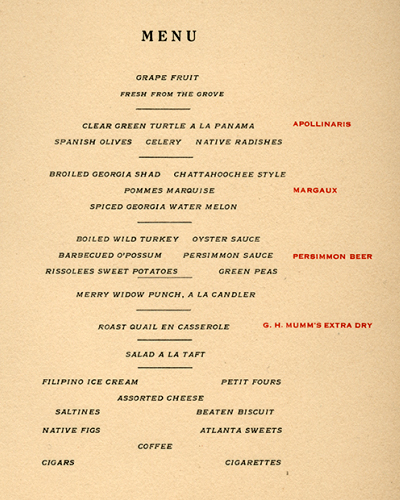 On January 15, 1909, US President-elect William Howard Taft attended a banquet at the Chamber of Commerce along with "the cream of Atlanta and the south's commercial factors, professional men, editors and railroad magnates" where the main course featured a winter trio of roasted opossum, sweet potatoes, and persimmon beer.1"Taft Eats 'Possum, Gives South Pledge," The New York Times, Jan. 16, 1909, 1. Several months earlier and prior to his election, Taft had become the first Republican candidate to venture into the Democratic "Solid South" during a presidential election.2David Charles Needham, "William Howard Taft, The Negro, and the White South, 1908–1912," (PhD diss., University of Georgia, 1970), 31. The Atlanta banquet represented a continuation of Taft's efforts toward sectional reconciliation as he pledged to "weld into a compact unit the North and the South."3"Taft Eats 'Possum, Gives South Pledge," 1. The event highlighted the white supremacist solidarities necessary for such political and economic reunification, with his speech elaborating policies that would assure federal appointments would not go to African Americans and that southern metal and cotton products would find commercial opportunities in Far Eastern markets.4William H. Taft, "The Winning of the South," Political Issues and Outlooks: Speeches Delivered Between August, 1908, and February, 1909 (New York: Doubleday, Page, 1909), 230–234.