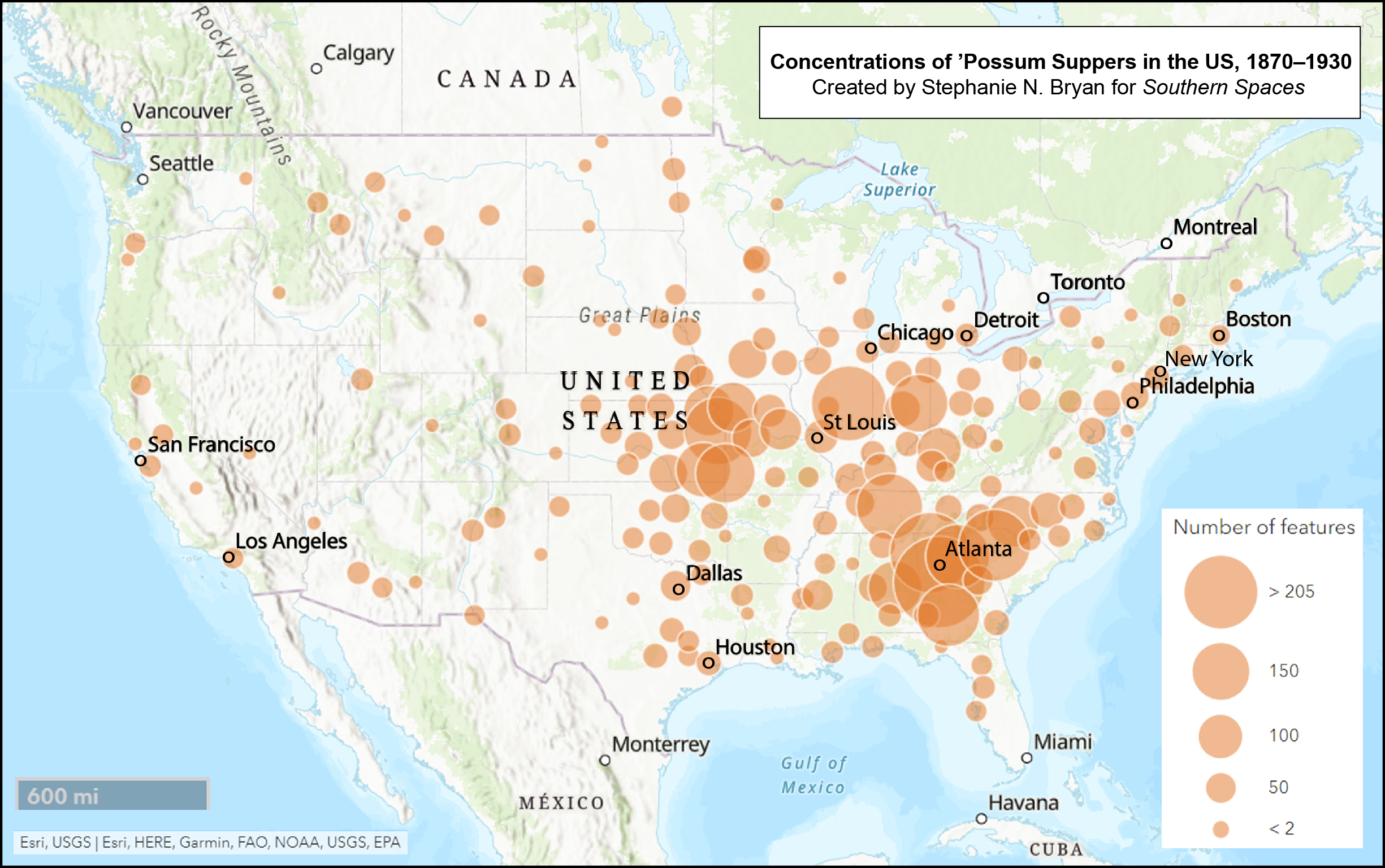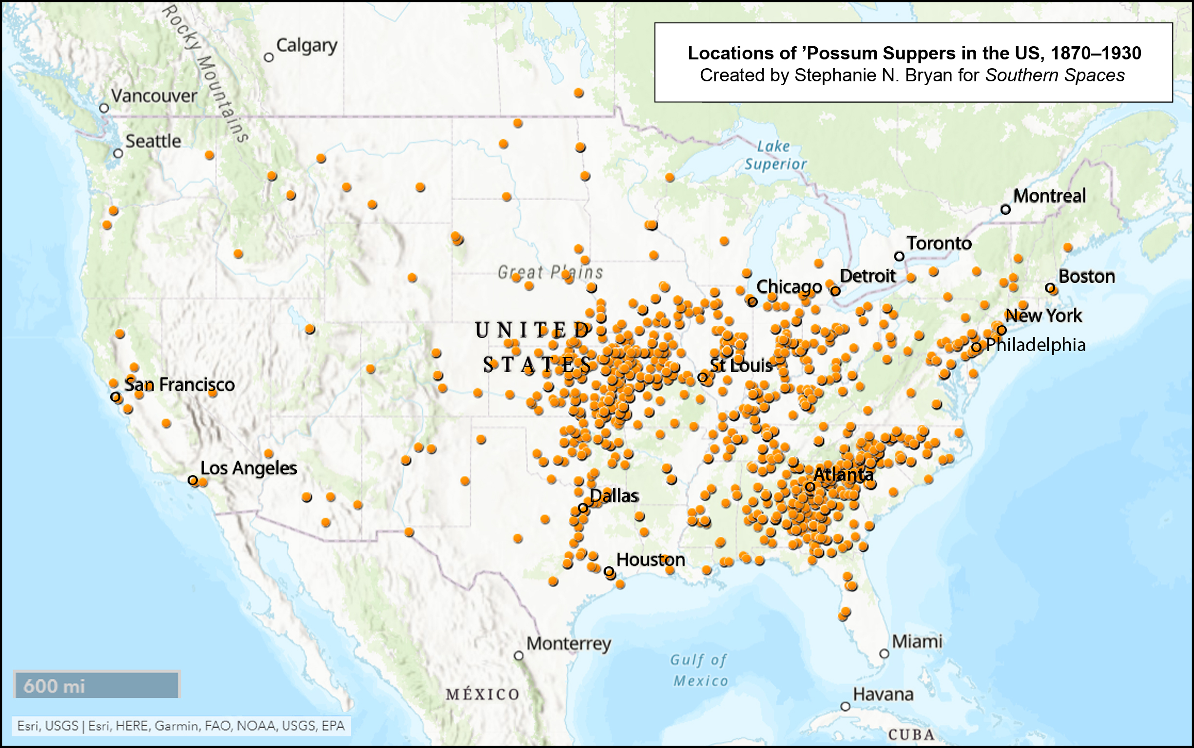 In the 1870s, opossum supper announcements became common in newspapers of southeastern states and occasionally in some northeastern and midwestern ones where freed people had begun to migrate. Early on, these events involved people of different socioeconomic classes and racial or ethnic backgrounds and occurred for a variety of reasons—from political gatherings to church fundraisers and more intimate domestic occasions. With time, Democratic politicians turned the opossum supper into a social event expressive of white men's solidarity.