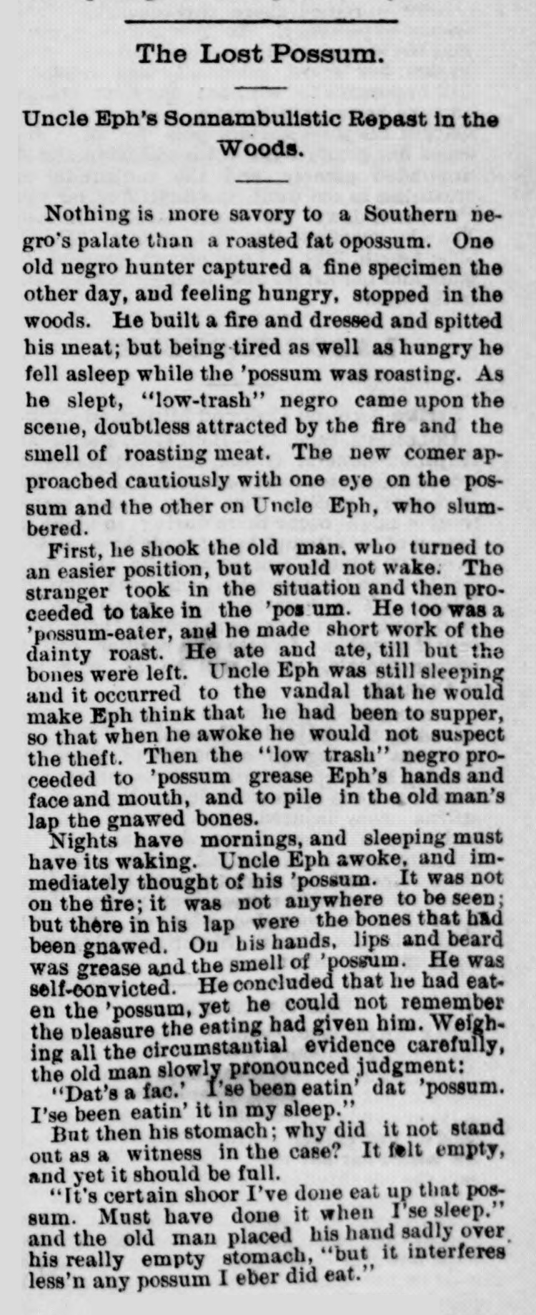 | 78. | "A 'Possum Supper," Baltimore (MD) Sun, Jan. 1, 1898, 1. For a similar version of this article, see "'Possum and 'Taters," The World (New York, NY), Jan. 1, 1898, 5. |