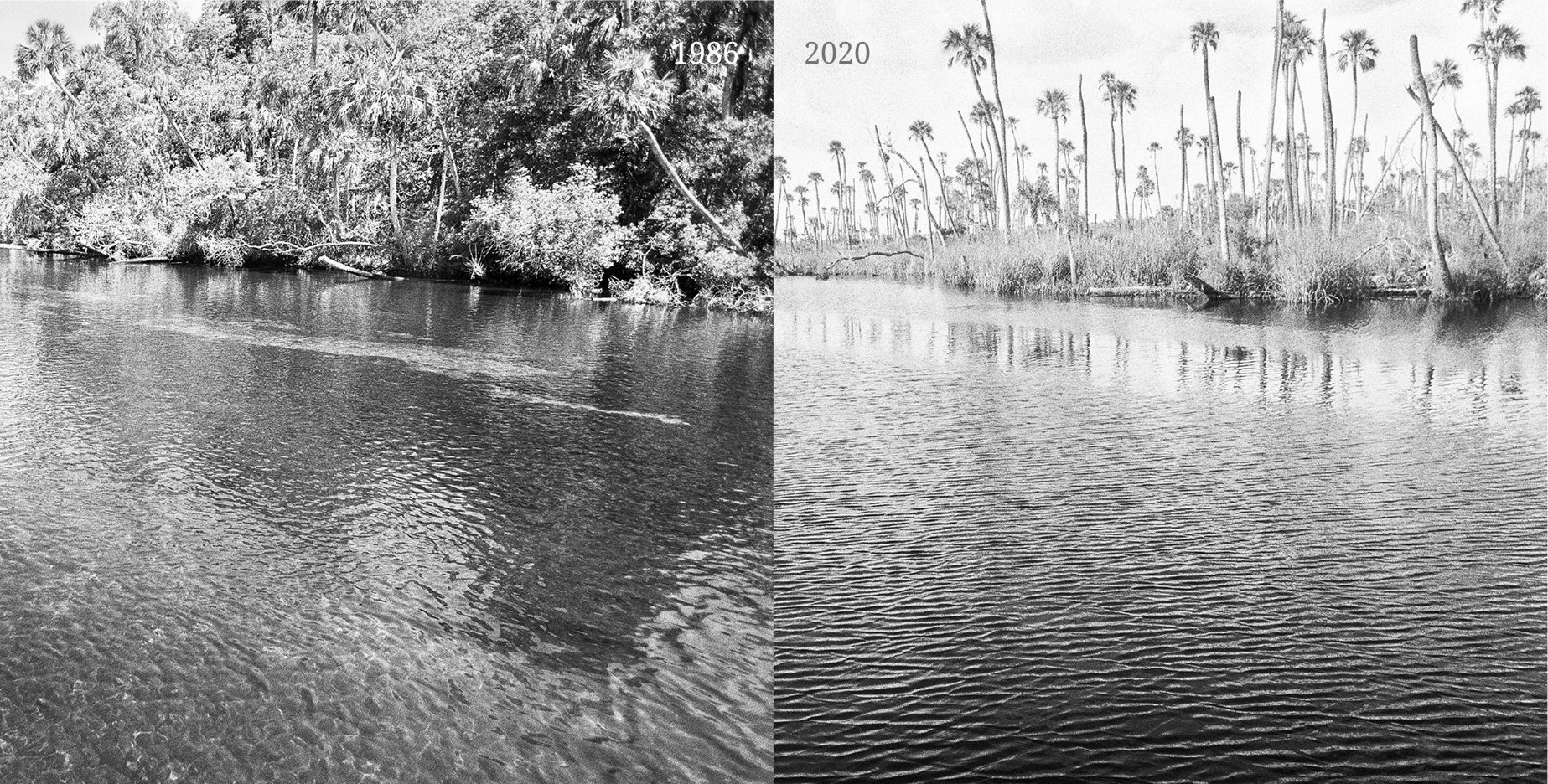 Dimmitt: I believe that this diptych shows the greatest span of time. This is from the dock looking downstream in 1986. And then the follow-up is 2020. It's the greatest span between the first and the second shot. If we were to go there now, half of the remaining palm trees in the back on the right would be gone.